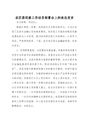 在区委巡察工作动员部署会上的表态发言各位领导、同志们:根据区委统一部署,我局被列为本轮巡察单位。这充分体现了区委对金融工作的高度重视,也体现了对我局加强党风廉政建设的关心与促进。我们将对照巡察工作的要求,认真学习领会,严格贯彻落实。下面,我代表区地方金融监管局,作表态发言。1.思想高度重视,自觉接受巡察监督。加强和改进巡察工作是中央和省市区委的鲜明要求,是落实全面从严治党主体责任的重要抓手,也是加强党内监督的重要举措。这次区委来地方金融监管局开展巡察工作,既是对我局全方位的政治体检,更是对我们新建局党建工作的高水平指导,有助于我们发现在强化党的领导、加强党的建设和全面从严治党等方面存在的问题,促使我们认识上更加到位、信念上更加坚定、工作上更加务实。我们将进一步强化政治意识,提高政治站位,充分认识开展巡察工作的重大意义,把这次巡察作为一次提升党建工作的机会、一次加强党性锻炼的机会、一次检验工作成效的机会、一次加快金融事业发展的机会,诚恳接受巡察组的检查和人民群众的监督,齐心协力把巡察任务完成好。体制写作整理推送,欢迎关注。2.全力支持配合,确保巡察顺利开展。高度重视、坚决支持、全力配合巡察组工作,是我局当前第一位的政治任务。为此,我们专门成立了巡察工作联络协调小组,为巡察组开展工作提供便利的条件。巡察期间,我们将无条件配合、无障碍提供巡察组需要的各类文件、材料,实事求是、主动客观地向巡察组汇报情况、接受检查,为巡察组了解情况、开展工作创造良好氛围和环境。我作为区地方金融监管局主要负责人,带领班子成员按照中央和省市区委关于巡视巡察工作提要求,合理安排好工作,准时参加巡察组要求的活动,查找自身和班子存在的突出问题,落实巡察组的各项工作安排和要求,全力支持和配合巡察组工作。3.对照反馈意见,强力推进落实整改。巡察是一次全面彻底的政治体检。区地方金融监管局将本着主动担当,认真负责的态度,做到巡察前即知即改、巡察中立行立改、巡察后全面整改。我们将诚恳接受巡察组的巡察监督,虚心听取各方意见,把自身存在的问题找准、找实、找透,正确对待巡察组提出的意见建议,勇于直面短板、主动认领问题,逐条梳理剖析、逐一找准症结。对巡察组指出的问题、差距、薄弱环节,认真制定整改方案,明确问题整改清单、责任落实清单、督查推进清单,确保件件有着落、事事有交待。4.以巡察工作为动力,推动地方金融发展。巡察工作既是检查和监督,更是鞭策和促进。当前形势下,如何在坚持金融监管主要是中央事权的前提下,进一步完善地方金融监管体系,制定新办法、探索新模式,发挥好地方政府在推动企业上市、加强金融监管和风险处置中的作用,是一项艰巨的任务。我们将以巡察为契机,在履职尽责中充分展现地方金融监管局队伍的凝聚力、战斗力和号召力,认真检视金融工作中的不足,紧扣推动企业上市、服务实体经济、防控金融风险、强化地方金融监管四大任务,围绕全区工作中心,着力提升金融服务水平,切实提振发展信心;聚焦资本市场,持续做好企业直接融资服务;坚决打好金融攻坚战,增强企业群众的安全感。推动全区金融事业迈上新台阶、取得新成效,以加快地方金融发展的实效体现巡察工作的成效。谢谢!