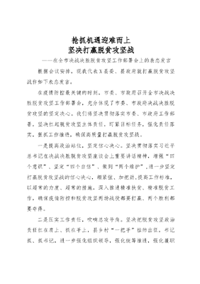 抢抓机遇迎难而上坚决打赢脱贫攻坚战——在全市决战决胜脱贫攻坚工作部署会上的表态发言根据会议安排,现我代表X县委、县政府就打赢脱贫攻坚战作如下表态发言。在疫情防控最关键的时刻,市委、市政府召开全市决战决胜脱贫攻坚工作部署会,充分体现了市委、市政府决战决胜脱贫攻坚的坚定决心。我们将坚决贯彻落实市委、市政府工作部署,坚决扛起脱贫攻坚主体责任,盯紧目标任务,强化责任落实,狠抓工作推进,确保高质量打赢脱贫攻坚战。一是提高政治站位,坚定信心决心。坚决贯彻落实习近平总书记在决战决胜脱贫攻坚座谈会上重要讲话精神,增强四个意识、坚定四个自信、做到两个维护,进一步坚定打赢脱贫攻坚战的信心决心,绷紧弦、加把劲,提高工作标准,以超常的力度、超常的措施,深入推进精准扶贫、精准脱贫工作,确保疫情防控和脱贫攻坚两场战役都要打赢、两个胜利都要夺得。二是压实工作责任,吹响总攻号角。坚决把脱贫攻坚政治责任扛在肩上、抓在手上,县乡村一把手挂帅出征,书记抓、抓书记,进一步强化组织领导,强化统筹推进,强化履职担当,紧锣密鼓推动任务落实;坚持以上率下,以身作则,持续压紧压实乡镇书记和乡镇长、县直部门负责人、县级工作专班负责人、驻村工作队队长和帮扶责任人的责任,一级做给一级看,一级带着一级干,层层传导压力,唤醒责任意识,全员动员、全员驻村、全员冲锋,以最真帮扶、最实工作,确保群众满意度。三是发起最强攻势,完成摘帽任务。强化交总账意识严格落实四个不摘,紧紧围绕五个一批脱贫路径和六个精准工作要求,按照一达标、两不愁、三保障标准,全面推进四季攻势,坚决打好四场硬仗,聚焦重点难点,明确时间表、路线图,加大工作力度,拿出过硬举措办法,确保如期完成脱贫攻坚任务。坚持一户一策,强力精准推动,坚决攻克堡垒,集中力量把贫困问题歼灭,确保剩余的X户XX人顺利脱贫。同时积极巩固脱贫攻坚成果、防止反弹,认真查找漏洞缺项,对存在返贫风险和致贫风险的人群,实施针对性预防措施,及时将返贫和致贫人口纳入帮扶。四是严明纪律规矩,锻造过硬队伍。坚持把干部作风建设摆在脱贫攻坚工作突出位置,从细处着手,从实处着力,以踏石留印、抓铁有痕的钉钉子精神抓好作风建设,以严格的纪律保障精准脱贫责任落实,以强化干部作风建设护航脱贫攻坚工作,使精准脱贫更透明、更精准。坚持在脱贫一线了解干部、识别干部、检验干部、发现干部,对敢于担当、默默无闻、敬业奉献的扶贫干部,给待遇、给褒奖、给位子,对漫不经心、敷衍应付、慵懒散漫的干部,坚决严肃问责,切实汇集起决战决胜脱贫攻坚的清风正气。在此,我们向市委、市政府郑重承诺,我们将以此次会议为契机,在推进脱贫攻坚上再加力、再深入、再落实,全力以赴打赢脱贫攻坚战,确保我县未脱贫的X户XX人全部脱贫,以优异的成绩向党和人民交一份满意的答卷。
