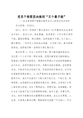 党员干部要坚决做到五个最不能——在全县领导干部警示教育会议上的表态发言材料各位领导、同志们:刚才,我们一同观看了警示教育片《X严重违纪违法案件启示录》。看过以后,深受震撼、深受教育。X作为党员领导干部,置组织厚望、群众期待、纪律规矩于不顾,忘了初心、腐化堕落,一步步走上违纪违法道路、沦为阶下囚,教训惨痛而深刻,值得我们每一名领导干部认真反思:教训反思一:作为一名党员干部,最不能动摇的是信念。信念是一个人对于某一理论准则、思想见解坚信无疑的看法,是激励人按照自己的观点、原则和世界观去行动的的思维倾向。当今社会,各种矛盾相互交织,多种文化相互激荡。坚定理想信念,并将其内化为忠诚于党、忠诚使命的价值追求,比任何时候都更具现实意义。从《X严重违纪违法案件启示录》警示教育片中,我们不仅看到了X等人的不轨之念、不轨之思,故布迷阵,在任期间左右逢源的丑陋行径。同时,也看到了X等人革命意志衰退,丧失了理想信念,思想空虚,私欲膨胀,对社会主义前途产生了这样那样的动摇。前车之鉴,后事之师。为此,党员干部要切实加强理想信念教育,真正从世界观、人生观、价值观上解决问题。要持续深化巩固不忘初心,牢记使命主题教育成果,切实解决人生为什么,入党做什么,掌权干什么这一重要问题,不断提高党性修养,使各种腐朽鄙劣的东西没有可乘之机,在新的征途上迈出坚定步伐,永远站在新时代的最前列。教训反思二:作为一名党员干部,最不能忘记的是初心。在党的十九大报告中,习近平总书记提出了不忘初心,牢记使命的重要论述。对于党员干部而言,不忘初心,就是坚持在其位,谋其政的为政之道;牢记公生明,廉生威的为官箴言;保持不忘初心,牢记使命的为官本色。《X严重违纪违法案件启示录》警示教育片警示我们,权力和资本绝不可以进行交换。如果党员干部搞官商勾结,用党和人民赋予的权力为少数不法商人谋取私利,忘记我是谁、为了谁、依靠谁的初心,只能是在错误的道路上越行越远,后果不堪设想。在取得反腐败斗争压倒性胜利的今天,作为一名党员干部,不忘初心,牢记使命,就是让我们永远保持建党时中国共产党人的奋斗精神,永远保持对人民的赤子之心。时刻牢记无论我们走得多远,都不能忘记走过的路;无论我们走到多么光辉的未来,都不能忘记为什么出发。做到权大不忘责任重,位高不移公仆心。就是要抓好以案促改的再学习再教育,树牢四个意识,坚定四个自信,做到两个维护。教训反思三:作为一名党员干部,最不能淡化的是事业。贪了10年,玩了10年,耽误了10年。结交一批老板,带坏一批干部,重创了政治生态和发展环境。这是许多X干部对X的评价。他们变着法子违背党的组织路线、形成自己的小圈子,导致X政治生态中正气不彰、歪风横行,污染不断扩散。勿以善小而不为,勿以恶小而为之。通过观看《X严重违纪违法案件启示录》警示教育片,我认为一名党员干部,一定要按照习近平总书记讲话精神,进一步强化淡泊名利、倾心事业的奉献精神,正确处理个人利益与集体利益的关系,把全部心思和精力用在工作上,把X发展的损失补回来。要强化立足实际、真抓实干的务实精神,按照县委县政府规划的战略目标,一招一式抓工作,一点一滴求实效,精益求精搞建设。要把弘扬跨越发展、争创一流;比学赶超、奋勇争先作为工作责任来践行,以新的精神状态和奋斗姿态为两个一百年奋斗目标做贡献。教训反思四:作为一名党员干部,最不能冲破的是底线。习近平同志指出:干部廉洁自律的关键在于守住底线。只要能守住做人、做事、用权、交友的底线,就能守住党和人民交给自己的政治责任,守住自己的政治生命线,守住正确的人生价值。这些片中人,有的为自己搭天线、攀高枝,为政治上的更高追求谋求捷径和便利;有的贪图钱财,追求享受,喜欢在灯红酒绿中流连忘返;有的贪恋美色,沉醉于温柔乡,进行权色交易,拜倒在石榴裙下。他们一个个各怀鬼胎、各取利益,构建没有底线的怪圈。正道被堵,邪路大开,埋头苦干的老黄牛得不到提拔重用,善于投机攀附的人却平步青云,用人导向被严重扭曲,对政治生态造成了严重破坏。作为一名党员干部,手中多少都有一定的权力,可谓是双脚常在河边走,双手常在利上过,身边刻画着一脚在监狱外面,一脚在监狱里面的底线。今天,我们吸取他们的惨痛教训,就是要知敬畏、存戒惧、守底线,注重加强自身道德修养,堂堂正正做人,老老实实办事,清清白白为官。就是要抵制拜金主义、享乐主义、官僚主义的影响,以谨慎之心对待权力、以敬畏之心使用权力。就是要扎紧法治笼子,增强管党治党意识,做到党中央提倡的坚决响应,党中央决定的坚决执行,党中央禁止的坚决不做。教训反思五:作为一名党员干部,最不能忽视的是交往。如何交友不是个人生活情趣方面的小问题,而是执政理念、人生观、权力观和利益观,以及工作的关注点和