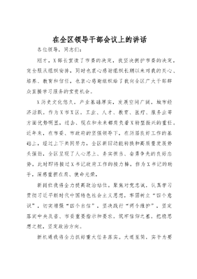 在全区领导干部会议上的讲话各位领导,同志们:刚才,X部长宣读了市委的决定,我坚决拥护市委的决定,完全服从组织安排,同时也衷心感谢组织长期以来对我的关心、培养、教育和信任,也衷心感谢组织给了我向全区广大干部群众直接学习服务的宝贵机会。X历史文化悠久,产业基础厚实,发展空间广阔,城市经济活跃,作为X市X区,工业、人才、教育、医疗、服务业等方面优势明显,过去、现在和未来都肩负着X转型振兴的重任。近年来,在市委、市政府的坚强领导下,在历届良好工作的基础上,经过上下共同努力,全区新旧动能转换和高质量发展势头强劲,全区呈现了人心思上、务实担当、奋勇争先的良好态势,此时即将接过X书记政府工作的接力棒,作为X书记的助手,深感重担在肩、使命光荣,新岗位我将全力提高政治站位。聚焦对党忠诚,认真学习贯彻习近平新时代中国特色社会主义思想,牢固树立四个意识,切实增强四个自信,坚决践行两个维护,坚定落实中央及省、市委重要指示和要求,筑牢信仰之基,把稳思想之舵,坚定政治方向。新机遇我将全力抓好重大任务落实。大道至简,实干为要当前,全区正处于加速崛起、逆势赶超、转型升级的关键时期,将坚决落实区委决策部署,坚决维护区委权威,坚决维护班子团结,做到一张蓝图绘到底。聚焦产业项目建设,主动服务驻地社会各界,整合汇聚各方资源,主动加强与周边区域融合发展,聚人、聚气、聚才、聚英,引入创新活水,打造动能转换新引擎,加快工业转型振兴,推动服务业跨越发展,聚焦营商环境优化,推动流程革命性再造,对标先进勇创新,担当作为敢争先。新期待我将全力为群众谋福祉。聚焦民生,始终做到不忘初心、一心为民,将带着感情,脚踏实地、积极稳妥继续抓好民生改善,尽力而为,继续完善城乡配套,全面增强社会各界的归属感,全面增强干部群众的自豪感。新挑战我将全力抓好自身建设。聚焦作风建设,坚持把政治建设摆在首位,严格遵守中央八项规定,从严从实,坦荡做人,干净做事,严于律己,保持本色,依法行政,树立忠诚、干净、担当的良好形象。新时代,船到中流浪更急,人到半山路更陡。X的转型和跨越是我们不懈奋斗、共同打拼的荣耀事业,寄托着市委、市政府的殷切期望,同时也承载着所有X人的梦想和期待。下一步,将按照市委、市政府的先把经济搞上去的战略部署,紧紧依靠市委、市政府,在以X书记为班长的区委坚强领导和把关定向,紧紧依靠社会各界的共同努力和监督支持,认真贯彻守初心、担使命、找差距、抓落实的工作要求,在破解难题中实现稳中求进,担当作为,携手同行,奋力赶超,全力推动全区整体工作走在前列,努力开创新时代美丽X建设的新局面。
