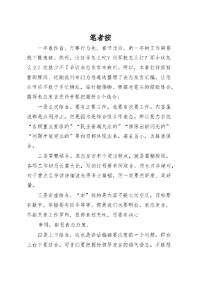 笔者按一年春作首,万事行为先。春节过后,新一年的工作将要摁下提速键。然而,出征号怎么吹?行军鼓怎么打?军令状怎么立?这就少不了会议表态发言来映衬。所以,本着打好提前量的原则,这期我们专门为您遴选整理了表态发言汇编,让您在节后不致于手忙脚乱,临时抱佛脚。根据老笔头的经验体会,撰写表态发言无外乎要把握好5个结合:一是主次结合。要有主要工作,也要有次要工作,内容虽说都是点到为止,但是因为是综合性工作表态,所以要力求把各级重点要求的民生普遍关注的推陈出新闪光的问题矛盾突出的等内容都体现出来,麻雀虽小,五脏要俱全。二是简繁结合。表态发言有个突出特点,就是篇幅较短,各项工作切忌长篇大论,写的过程要有所取舍。但也并非绝对,对于重点工作该详细说也得多占篇幅,但一定要把好度、定好量。三是实虚结合。实指的是内容不能太过空泛,目标要有数字,举措要有抓手等等。但是我们也要明白,表态发言,不能只是工作罗列,显得索然无味,还要有决心串词,彰显表态力度。四是上下结合。这也是讲话稿都要注意的一个问题,即台上台下要结合。写手们要把握好领导发言的语气语态,不能想怎么写就怎么写,领导念不出来写得再好也是白写。表态发言要掷地有声、斩钉截铁,为此推荐多用短句、多用排比。五是新旧结合。虽说是新年度工作要有新亮点,但是打基础的长期工作也不能丢。从实际工作来看,例行性工作还是占据大多数,因此,文稿内容中要做到新旧有机结合。党政机关表态发言(范文)市人社局将根据市委、市政府决策部署,按照高质量发展要求,突出重点、勤勉尽责、担当实干、创新有为(连续短语,彰显表态决心),奋力开创全市人力资源和社会保障事业发展新局面。一是强化人才支撑。摸清底数,找出人才工作的短板弱项;调研重点建设项目和重点产业,发布人才尤其是高层次人才需求目录。参与研究制定并深入落实全市含金量较高、具有较大引力作用的X计划,加强宣传推介,促进各类人才为我所用(有因有果,结构完整)。实施第X届X特别奖选拔,重奖突出贡献人才及团队,发挥示范引领作用。大力培养引进急需紧缺人才,年内引进硕士X人、博士X人、海外高层次人才X人、外国专家X人次,培训培养企业管理人才X人、高技能人才X万人(靠数字说明,工作有具体目标,表态发言内容丰满)。搭建平台载体,新建特邀院士工作站X家、博士后科研工作站X家、高技能人才培训基地X个,依托我市驻X、X人才机构,扩大国际和跨区域人才引进。二是夯实民生之基。梳理适合我市新一轮促进就业创业政策,宣传推介、精准落实。以破解就业总量矛盾与结构性矛盾为着眼点,探索建立支持新兴就业创业形态的服务体系。以高校毕业生等青年群体、就业困难人群、退役军人为主体,加强定单式培训,满足企业发展急需(工作有具体抓手,内容显得充实);做大做强人力资源市场,强化就业服务,促进人岗匹配;全面加强职业教育和就业培训工程,提升劳动者就业能力。以创业孵化基地扩容提质为抓手,发挥创业带动就业倍增效应,帮扶成功创业X人,带动就业X万人以上。全年实现城镇新增就业X万人以上,登记失业率X%以内。三是完善社会保障。强征缴、保发放,把企业职工养老保险作为重中之重,全力推进扩面征缴攻坚,确保养老、工伤、失业、医疗、生育各险种可持续发展。实施全民参保计划,以中小微企业和农民工、灵活就业人员、新就业形态人员、未参保居民为重点,引导各类用人单位和人员长期持续参保。进一步强化社保基金稽核监督,规范收支存管理,狠抓风险防控,确保平稳运行。推出一系列惠民政策,提高退休人员养老金水平,推进城乡居民养老保险缴费档次和待遇提升,提高职工医保待遇,进一步完善城乡居民医保、异地就医直接结算和贫困人口基本医疗、大病保险、医疗救助X等制度(此段落虽然简短,但是涵盖所有重点关注民生内容,涵盖面广、信息量大,每一句话均有所指,对于写手来说要具备较强的归纳能力)。四是优化营商环境。全面梳理服务事项目录清单、权力清单、责任清单,通过行政审批和管理服务事项流程再造,按审批最少、收费最低、办事最快、服务最优(4个排比,内容清晰明了,一听就懂;短语句眼在最字,说明表态坚决)X要求,推进服务标准化。全面开通社保卡X项使用功能,年内持卡人数达到X万人,持卡率达到X%。围绕让群众最多跑一次最好不用跑实施互联网+人社建设提升,提升信息化总体建设水平,推进人社业务全域通办、一窗受理、一网办结,纵向实现市、县、乡、村互联互通,横向实现人社业务领域全覆盖、经办过程全覆盖、服务范围全覆盖,最大限度便民便企。目录1.市级表态发言(1)72.市级表态发言(2)93.市级表态发言(3)