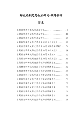 调研成果交流会主持词+领导讲话目录主题教育调研成果交流发言13主题教育调研成果交流发言2..11主题教育调研成果交流发言3..23主题教育调研成果交流会主持词(公司版).29主题教育调研成果交流会主持词(国企集团版)34主题教育调研成果交流会主持词(机关版).38主题教育调研成果交流会主持词(县级)42主题教育调研成果交流会主持词(政府版).45主题教育调研成果交流会领导讲话摘录1.50主题教育调研成果交流会领导讲话摘录2.52主题教育调研成果交流会领导讲话摘录3.54主题教育研讨成果交流会领导讲话摘录4.56主题教育调研成果交流会领导讲话摘录5.58主题教育调研成果交流会领导讲话摘录6.60主题教育调研成果交流会领导讲话摘录7.62主题教育调研成果交流会领导讲话摘录8.64主题教育调研成果交流会领导讲话摘录9.66主题教育调研成果交流会领导讲话摘录1068做好四篇文章,推动调查研究不断走向深入(集团公司版).70主题教育调研成果交流发言1各位领导、同志们:第二批不忘初心、牢记使命主题教育展开后,我们充分踩实调查研究这个重要步骤,以此作为深化主题教育效果、转化主题教育成果的重要手段,按照方案具体部署,历时×天,重点对××个××和××个××进行了调查研究,共梳理总结出×个方面××个矛盾问题点,同时研究制定了×个措施办法。现向各位领导和同志们做个汇报:一、坚持问题导向,找准党员干部和群众反映最集中的具体情形纠正四风、落实中央八项规定精神是一场攻坚战、持久战。调研发现,党员干部和群众反映最集中的形式主义、官僚主义问题具体情形,呈现三多三变五缺乏特点。三多,即会议文件多、检查考核多、报告报表多。有的执行文件、会议、简报等相关制度搞变通,正式发文减少,但利用电话传真、短信微信、电子信箱、QQ等渠道下发文件不在少数;正式会议减少,但各种专题会、推进会、研究会多起来了,且大多要求主要领导参加。比如,某乡镇201×年全年收到各类来文来函×余个,参加上级召开的各类会议×余次。有的刚布置完一项工作,马上就要求上报推进情况、总结报告和经验做法,填报各类表格,检查考核紧随其后,基层疲于应付,甚至弄虚作假。又如,某乡镇党委书记反映,曾一天迎接过×个部门检查,且都要主要领导陪同,否则不能体现重视。再如,有的地方把文件下发、会议召开、图片记录等情况作为检查考核硬指标,把工作创新变成材料创新,大量人力精力耗费在文山会海之中。某街道迎接创卫检查验收,准备文件资料目录长达×页,全部内容可以装满半间屋子,且不同领导要求不同,先后×次返工重做。三变,即工作下沉变办公室下沉、责任下沉变责任书下沉、事项下放变苦事累事难事无好处的事下放。有的落实工作喜欢横向到边、纵向到底,但往往是办公室到边、到底,人没到、内容没到。有的把层层压实责任变成层层签订责任书、承诺书、保证书,成了层层推卸责任。比如,某区县签订责任书×种,有的甚至把责任书签到普通群众一级,且要求全覆盖,要求村(社区)所有群众签订森林防火责任状,社区所有司机签订交通安全责任状。又如,有的行政审批事项不允许收费后,一放了之,并要求通过第三方机构出具审核报告(如安全风险评估、环境保护评估、立项可研报告等),致使第三方机构变成二政府,少数第三方机构恃权态度蛮横、收费昂贵。五缺乏,即缺乏调查研究、缺乏换位思考、缺乏协同配合、缺乏服务意识、缺乏责任担当。有的安排工作不调研、不思考,拍脑袋、凭空想,只管自己需要,不管能否办到,只管面上好看,不管实际成效。有的制定文件、出台政策不接地气,群众看不懂、问不明。有的本位主义突出,只站在本部门角度看问题。有的政策相互冲突,部门互不相让,群众无所适从。有的机械执行政策规定,即使与实际不相符,群众怨声载道也不管不问。比如,某社区支部书记反映,办理社区办公用房产权证时,经办同志给出一份清单,要求提供×项证明材料,自己作为支部书记都看不懂,也不知该找谁出具,普通干部群众办理难度可想而知。又如,某乡镇反映农村还建房屋问题,管征地的不管建设、管建设的不管征地,建成后的户型、面积、数量不符合群众意愿,分配工作难开展。二、深入剖析病因,明确纠正形式主义、官僚主义问题的具体靶向形式主义、官僚主义点多面广、形式多样、成因复杂,既
