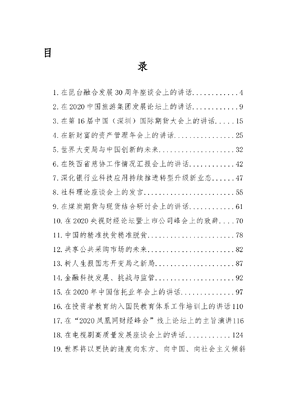 目录1.在昆台融合发展30周年座谈会上的讲话42.在2020中国旅游集团发展论坛上的讲话93.在第16届中国(深圳)国际期货大会上的讲话..154.在新财富的资产管理年会上的讲话.255.世界大变局与中国创新的未来..326.在陕西省慈协工作情况汇报会上的讲话427.深化银行业科技应用持续推进转型升级新业态478.社科理论座谈会上的发言559.在煤炭期货与现货结合研讨会上的讲话6110.在2020央视财经论坛暨上市公司峰会上的致辞.7011.中国的精准扶贫精准脱贫..7812.共享公共采购市场的未来..8213.树人生报国志开变局之新局8714.金融科技发展、挑战与监管9215.在2020年中国信托业年会上的讲话..9716.在投资者教育纳入国民教育体系工作培训上的讲话11017.在2020凤凰网财经峰会线上论坛上的主旨演讲11618.在电视剧高质量发展座谈会上的讲话12419.世界将以更快的速度向东方、向中国、向社会主义倾斜13620.在全区城市大脑萧山平台建设比学赶超活动推进会上作交流发言.14821.努力弘扬企业家精神勇于担当市场主体责任15222.在中国佛教协会第十次全国代表会议开幕式上的讲话.161在昆台融合发展30周年座谈会上的讲话刘结一2020年12月25日尊敬的宁吉喆副主任、娄勤俭书记,尊敬的李政宏会长,各位嘉宾、各位朋友:很高兴应邀参加昆台融合发展30周年座谈会。我代表中共中央台办、国务院台办对昆台融合发展30周年和座谈会的召开表示热烈祝贺,向为昆台融合发展作出贡献的两岸各界人士特别是台商台胞朋友表示衷心感谢,并致以诚挚问候。1990年10月,首家台资企业落户昆山,开启了昆山与台商台胞携手拼搏30年的历程,走出一条具有昆山特色的昆台融合之路。在江苏省委省政府、苏州市委市政府领导下,昆山经济社会面貌发生巨大变化,经济实力多年蝉联全国百强县之首,其中凝聚着台胞的贡献,也为台企做大做强拓展出新天地。大批台企、台胞慕名而来,30年间累计有5300多家台资企业落户昆山,近10万台胞在此安居乐业。台企台胞为昆山发展作出重要贡献,也分享了巨大发展机遇,取得在岛内难以想象的成就。一大批中小台企在昆山成长壮大,6家企业在大陆A股上市。今天上午,我走访了在昆台资企业、台胞家庭,深切感受到两岸融合发展在昆山不断开花结果,两岸命运共同体成为生动的现实。苏台、昆台融合发展的成功实践,是两岸同胞携手把两岸融合发展道路走宽走实的缩影。第一,经济合作是深化两岸融合发展的坚实基础。高水平的经济合作,是苏台、昆台融合发展取得突出成就的基础。经济合作不断扩大,强化了两岸产业链供应链纽带,带动了两地人员往来和各领域交流持续热络。两岸经济具有很强的互补性,祖国大陆广阔的发展前景必将推动两岸融合发展的道路越走越宽广。第二,民心所向是深化两岸融合发展的不竭动力。昆台融合发展的主体是百万昆山市民与数万常住台胞,大家朝夕相处、守望相助,生动诠释了两岸一家亲。两岸同胞同根同源、同文同种,血浓于水的情感和民族认同是两岸融合发第三,制度安排是深化两岸融合发展的重要保障。2013年,国务院批复设立昆山深化两岸产业合作试验区,支持昆山开展对台合作先行先试,为昆合融合发展指明前进方向。昆山市委市政府落实落细31条措施、26条措施、11条措施等惠台利民政策措施,并根据台胞台企需求采取更多举措,为昆台融合发展提供助力。不断完善的制度安排和政策措施,是两岸融合发展行稳致远的依托。我们要继续积极推进两岸经济合作制度化,打造两岸共同市场。第四,共建共享是深化两岸融合发展的根本途径。昆台融合是共建共享的融合。两岸同胞对美好生活有着共同的追求。两岸关系和平发展、融合发展要两岸同胞共同推动、共同维护、共同分享。事实表明,两岸同胞携手努力,就能不断创造辉煌,就能在融合发展过程中共同实现对美好生活的向往,共建共享祥和、安宁、繁荣、尊严的共同家园。近日,国务院批复同意扩大昆山深化两岸产业合作试验区范围至昆山全市,江苏省人大常委会审议通过《昆山深化两岸产业合作试验区条例》。这对昆台融合发展创造了新机遇、设定了新标杆。希望昆山把握机遇,开拓