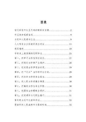 目录宿迁新任市长王天琦的精彩发言稿2牢记使命砥砺奋进..9为党和人民建功立业9人大常委会主任就职表态发言14感恩福地19号称史上最深情的任职讲话..25第一,把学习当作信仰去追求。.27第二,把稳定当作尊严去维护。.28第三,把发展当作梦想去实现。.29第四,把尼江当作标杆去打造。29第五,把改革当作使命去担当。.29第六,把人民当作英雄去尊重。.30第七,把廉政当作生命去珍惜。.30第八,把团结当作眼睛去爱护。.31第九,把党建作为天职去履行。.31黄奇帆当选市长就职讲话.33要始终把人民满意作为最高标准.35人大常委会主任就职表态发言39事业是官员的年轮.45全力争当宿迁生态经济示范区建设排头兵..53在周口市第四届人民代表大会59第一次会议闭幕式上的讲话..59十多十少就职讲话65在县人大常委会任命人员就职宣誓仪式上的讲话..73告别宿迁的离任讲话..77省委书记离任时的讲话84市委书记在离任时的讲话.89王晓光同志离任时在全市领导干部..96大会上的发言..96夏宝龙离任浙江省委书记时的告白.1032013年新任市长就职演讲稿.108县委书记就职表态发言..112县民政局局长就职报告表态发言118领导干部离职讲话121当选市长后的讲话126宿迁新任市长王天琦的精彩发言稿尊敬的蓝书记、各位主任,尊敬的各位代表:某一个日子只有同特别的事情联系起来,才具有重要的意义。对我而言,今天注定是一个特殊而难忘的日子,不仅因为我当选宿迁市人民政府市长,更为重要的是,得到了大家的信任和支持。尤其神奇的是,蓝书记当选市长是13号,今天是14号,注定了我和蓝书记等同志的革命友谊,和宿迁人民的情缘从此一生一世。在此,我向各位主任、各位代表,并通过你们向全市人民表示最衷心的感谢!从大家的掌声中,我感受到了真诚,这份真诚,来自代表们投下的每一张选票,更来自大家信任的目光、友善的微笑和热情的鼓励。从大家的掌声中,我感受到了责任,这份责任,源于人大代表的期许,更源于父老乡亲的重托。从大家的掌声中,我感受到了压力,这份压力,源自能否继续保持经济社会快速发展的良好势头,更源自能否如期如实完成全面小康的建设任务。当然,这份压力也与我的岗位有关,建市18年来,历任市长都干得十分出色,所以接棒的压力非常之大。自去年2月份到宿迁工作以来,在深入调查研究的同时,我紧紧围绕市委的决策部署,心无旁骛抓执行、抓推进、抓落实,从中感触颇深、获益良多。在招商引资、项目推进中,广大党员干部冲锋在最前沿、服务在第一线,激扬了我们推进新型工业化的士气和动力。在行政审批制度改革中,各职能部门心系发展大局、服从指挥调度,坚定了我们深化改革创新的信心和决心。在三创联动工作中,社会各界义无反顾地支持创建、合心合力地推进创建,增强了我们志在必得的力量和勇气。在民生六项工程尤其是老旧小区改造中,广大群众建言献策、热情参与、主动监督,深化了我们对尊重民意的理解和共识。尤其让我感动的是,市委特别是