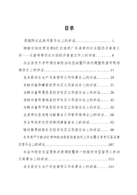 目录周强院长在执行督导会上的讲话.1脚踏实地攻艰克难8扎实推进广东省第四次全国经济普查工作——在督导第四次全国经济普查工作上的讲话..8在全县秋冬季环境污染防治攻坚战暨环保问题整改督导现场推进会上的讲话..14在全县安全生产巡查督导工作部署会上的讲话.19在暗访督导睢县脱贫攻坚工作座谈会上的讲话.27在暗访督导夏邑县脱贫攻坚工作座谈会上的讲话..38在暗访督导虞城县脱贫攻坚工作座谈会上的讲话..45在暗访督导宁陵县脱贫攻坚工作座谈会上的讲话..55王波局长在道路运输重点工作督导推进会上的讲话68在全市脱贫攻坚现场观摩督查会上的讲话..82暗访督导组组长在脱贫攻坚工作座谈会上的讲话..96在开展严守政治纪律和政治规矩自查自纠工作会暨主体责任落实情况督导会上的讲话.107在全市脱贫攻坚夏秋攻势调度暨新一轮脱贫攻坚督导工作动员部署会上的讲话..115在全县安全生产巡查督导工作部署会上的讲话134督导组点评县委办党支部组织生活会讲话.141在督导基层党组织书记抓党建工作述职评议会上的讲话146督导组长在专题民主生活会上的讲话..152在安全生产督查调研座谈会上的讲话..157在鹿城关于政协工作专题督查时的讲话162在巡视整改落实情况督查及回头看工作动员会上的讲话184在公司重点工作督察查办推进会上的讲话.192在全县督查工作会议上的讲话..195念好用好三字真经高效开展政府督查——在政府督查工作交流会上的发言..207在脱贫攻坚大督查工作反馈会上的表态发言..210在督查XX县落实党风廉政建设责任制情况会上的讲话213周强院长在执行督导会上的讲话2018年4月8日(根据录音整理)今天这个视频督导会议开的很好,万选才同志,赵洪印同志,廖伟忠同志,陆维东同志,孙强同志,任卫东同志做了很好的汇报。他们的介绍都各有特点,比如说万选才同志讲的,争取党委领导,政法委领导,充分发挥综治网格员作用。赵洪印同志讲到的,落实责任制,抓一把手,一把手抓。廖伟忠同志介绍的紧盯质效偏低的问题,不断提升执行质效。陆维东同志汇报的关于补齐短板,坚持问题导向问题。孙强同志汇报的八师釆取先予执行、财产保险的做法,起到了很好的效果。拉萨中院任卫东同志汇报的建立解决执行难例会制度。广东高院副院长徐春建同志,佛山中院院长赵菊华同志作了补充的汇报。河南高院院长胡道才同志着重强调了一把手的责任制。应该说在这方面河南是强有力的。郑州中院院长于东辉同志也介绍了这方面的情况。山东高院院长张甲天同志介绍汇报了全省法院在3月29号动员会议之后采取的措施,宁夏高院执行局局长杨晓红同志,介绍了宁夏全区法院的做法。新疆兵团专委胡志超同志作了补充汇报,介绍了兵团法院的做法和措施。西藏高院副院长郝银忠同志也做了补充汇报。同志们讲的做法很好,太部分法院釆取了实战的做法,制定了解决执行难的实战图,任务书,明确路径,倒排工期,一级抓一级,层层传导压力。总之,今天视频会议开的很好,各地介绍了很好的做法和经验。从各地汇报的情况来看,3.29会议之后,第一个是领导重视,及时向党委和政法委汇报,加强领导。第二,行动迅速,迅速召开会议,进行动员如署。第三,结合本地实际,创造性的开展工作。无论是六个法院的汇报,还是中高院负责同志的补充汇报,有很多切合实际、符合本地实际情况的做法和经验。这些做法和经验要认真总结,要坚持推进,同时要大力推广。大家在汇报发言当中也提出了很好的建议,关于完善信息化的问题,加大惩戒力度的问题,执转破的问题,解决财产变现难的问题,解决防止地方保护的问题等等,这些建议都很有意义最高法院要认真研究,加以解决。这里我再强调几点。第一,要进一步提高政治站位。要从贯彻落实十九大报告提出的全面依法治国方略,从贯彻落实习近平总书记在党的十八届四中全会上的重要讲话精神,贯彻党中央的决策部署的高度,进一步提高认识。能不能切实解决执行难,这是事关全面依法治国战略部署的落实。全国各级法院要进一步提高政治站位,要坚持以习近平新时代中国特色社会主乂思想为指导,武装头脑,指导实践,推动工作,要牢固树立四个意识,坚定四个自信,以敢打必赢的决心和信心投入到这场战役中,坚决打赢基本