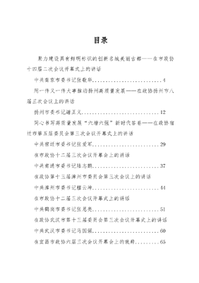 目录聚力建设具有鲜明标识的创新名城美丽古都——在市政协十四届二次会议开幕式上的讲话中共南京市委书记张敬华..4用一件又一件大事推动扬州高质量发展——在政协扬州市八届三次会议上的讲话扬州市委书记谢正义..12同心书写高质量发展六增六强新时代答卷——在政协宿迁市第五届委员会第三次会议开幕式上的讲话中共宿迁市委书记张爱军.29在市政协十二届三次会议开幕会上的讲话中共南通市委书记陆志鹏.37在政协第十三届漳州市委员会第三次会议上的讲话中共漳州市委书记檀云坤.44在市政协十二届三次会议开幕式上的讲话中共鹤岗市委书记张恩亮.51在政协武汉市第十三届委员会第三次会议开幕式上的讲话中共武汉市委书记马国强.60在宜昌市政协六届三次会议开幕会上的致辞65中共宜昌市委书记周霁65在市政协八届三次会议开幕式上的致辞中共鄂州市委书记王立71在市政协十四届三次会议开幕式上的讲话中共襄阳市委书记李乐成.77在市政协九届三次会议开幕式上的致辞中共仙桃市委书记胡玖明.84在市政协五届三次会议开幕会上的致辞.89中共十堰市委书记张维国.89在政协孝感市六届三次会议开幕式上的讲话中共孝感市委书记潘启胜.95在政协鸡西市第十二届委员会第三次会议开幕式上的讲话中共鸡西市委书记张常荣101在政协开幕会上的讲话(摘要)中共宣城市委书记陶方启111在政协崇左市第四届委员会第四次会议开幕会上的讲话中共崇左市委书记刘有明116为推动武进高质量发展走在前列而努力奋斗——在政协常州市武进区第十四届委员会第三次会议上的讲话中共武进区委书记李林..123在市政协十四届三次会议开幕式上的讲话中共常熟市委书记周勤第129在政协崇阳县第十届委员会第四次会议开幕会上的致辞中共崇阳县委书记杭莺..136在政协来凤县委员会九届三次会议开幕会上的讲话中共来凤县委书记邢祖训142聚力建设具有鲜明标识的创新名城美丽古都——在市政协十四届二次会议开幕式上的讲话中共南京市委书记张敬华(2019年1月8日)各位委员、同志们:新年伊始,政协南京市第十四届委员会第二次会议今天隆重开幕,这是全市人民政治生活中的一件大事。在此,我谨代表中共南京市委,向大会的召开表示热烈祝贺!时光荏苒,岁月如梭,我们一起走过了不平凡的2018年。一年来,在习近平新时代中国特色社会主义思想的科学指引下,在以习近平同志为核心的党中央坚强领导下,全市上下团结一心、砥砺奋进,对标找差、创新实干,扎实做好全面贯彻党的十九大精神开局之年的各项工作,主要经济指标稳中有进,创新名城建设起势良好,城乡环境面貌持续改善,三大攻坚战取得重要突破,人民生活水平实现新的提升,全面从严治党不断向纵深推进。尤其难能可贵的是,依靠全市上下的共同努力,我们实现了一批看似不易达到的目标,完成了一批看似不易完成的任务,破解了一批看似不易解决的难题,大家干事创业的精气神振奋而饱满,推动高质量发展的步伐从容而坚定。在这一过程中,全市各级政协组织、各民主党派、工商联无党派人士、各人民团体和社会各界人士付出了智慧、辛劳和汗水。一年来,新一届市政协牢牢把握团结和民主两大主题,紧紧围绕全市中心工作,聚焦建设学习型组织、强化智慧政协品牌、发挥资政顾问功能等工作目标,健全履职链条,形成工作闭环,政治立场更加坚定,服务发展更加主动,民主监督更加有力,团结协作更加广泛,在高质量建设强富美高新南京中发挥了重要而独特的作用。在此,我谨代表中共南京市委,向市政协、向全体政协委员、向支持南京经济社会发展的各界人士,表示衷心感谢并致以崇高敬意!各位委员,同志们!一个时代有一个时代的主题,一代人有一代人的使命。南京,是我们共同生活、为之奋斗的