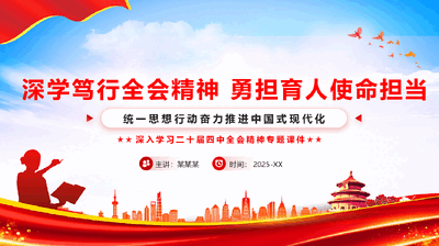深学笃行全会精神 勇担育人使命担当★★深入学习二十届四中全会精神专题课件★★统一思想行动奋力推进中国式现代化主讲:某某某时间:2025-XX前 言党的二十届四中全会审议通过了《中共中央关于制定国民经济和社会发展第十五个五年规划的建议》,擘画了中国未来五年的发展蓝图,提出了十五五时期经济社会发展的主要目标,宣示了乘势而上、接续推进中国式现代化的坚定决心。作为教育战线的党员和教师,我们肩负着为党育人、为国育才的神圣使命,深刻领会全会精神、准确把握实践要求,既是政治责任,更是推动学校高质量发展、培养时代新人的根本遵循。全会精神解读:把握历史方位,明确战略导向01重大意义阐释:明晰发展新程,夯实教育基石03教育使命对接:领会全会精神,践行教育使命02目录践行担当作为:不忘教育初心,绘就发展蓝图04第一部分全会核心精神:把握历史方位,明确战略导向一、全会核心精神:把握历史方位,明确战略导向2025年10月20日至23日,党的二十届四中全会在北京胜利召开。这次会议处于十四五收官与十五五开局的历史交汇点,具有承前启后、继往开来的里程碑意义。全会听取和讨论了习近平总书记受中央政治局委托所作的工作报告,审议通过了《中共中央关于制定国民经济和社会发展第十五个五年规划的建议》,全面总结了十四五时期发展成就,科学谋划了十五五时期发展蓝图,为全面建设社会主义现代化国家