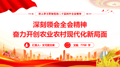 汇报人:文可居文库文稿7700 字深刻领会全会精神奋力开创农业农村现代化新局面党的二十届四中全会是在我国即将进入基本实现社会主义现代化夯实基础、全面发力的关键时期召开的一次十分重要的会议,是乘势而上、接续推进中国式现代化建设的又一次总动员、总部署,必将对党和国家事业发展产生重大而深远的影响。全会审议通过《中共中央关于制定国民经济和社会发展第十五个五年规划的建议》(以下简称《建议》),对十五五时期我国经济社会发展作出系统谋划和战略部署。前言加快建设农业强国,是推动乡村全面振兴走深走实、走好中国式现代化之路的必然选择。《建议》提出,坚持把解决好三农问题作为全党工作重中之重,促进城乡融合发展,持续巩固拓展脱贫攻坚成果,推动农村基本具备现代生活条件,加快建设农业强国。这充分体现了以习近平同志为核心的党中央对三农问题一以贯之的高度重视,释放了党在治国理政中坚持农业农村优先发展的强烈信号和历史主动性的使命担当。广大党员干部要深入学习领会全会精神,准确把握政策内涵、举措要求和工作重点,凝心聚力、扎实工作,推动乡村全面振兴、农业强国建设不断取得新进展,奋力开创农业农村现代化新局面。前言前言01回顾十四五时期农业强国建设取得的新进展02充分认识十五五时期加快建设农业强国的重要意义03 深入学习全会对十五五农业农村工作的重点部署04贯彻落实全会精神 共绘