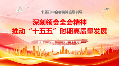 主讲:文可居文库时间:202X.XX.XX奋力推进中国式现代化实践新篇二十届四中全会于2025年10月20日至23日在北京召开学习贯彻党的二十届四中全会精神党的二十届四中全会,是在十四五即将收官、十五五即将开启的关键节点召开的一次具有全局性、历史性意义的重要会议。全会审议通过的《中共中央关于制定国民经济和社会发展第十五个五年规划和二〇三五年远景目标的建议》,高瞻远瞩、思想深刻、内涵丰富,深刻总结了十四五时期我国发展取得的非凡成就,科学谋划了十五五时期我国经济社会发展的宏伟蓝图,是指导未来五年乃至更长时期我国经济社会发展的纲领性文件。学习好、宣传好、贯彻好全会精神,是当前和今后一个时期全市上下的首要政治任务。前言PREFACE目录系统学习、深刻领会,完整、准确、全面把握党的二十届四中全会精神01顽强拼搏、真抓实干,开创我市现代化建设新局面02求真务实、久久为功,不折不扣推动党的二十届四中全会精神落实到基层、落实到一线03系统学习、深刻领会完整、准确、全面把握党的二十届四中全会精神二十届四中全会于2025年10月20日至23日在北京召开PART ONE第一部分壹中国共产党二十届四中全会(一)深刻把握党的二十届四中全会召开的重大历史地位全会公报明确指出,十四五时期是我国实现第一个百年奋斗目标之后,乘势而上开启全面建设社会主义现代化国家新征程、向第二个百年奋斗目标进军的