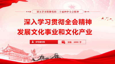 深入学习贯彻全会精神发展文化事业和文化产业文可居文库文稿:6800 字党的二十届四中全会是在向第二个百年奋斗目标进军的新征程上举行的一次十分重要的会议。习近平总书记在全会上发表的重要讲话和全会审议通过的《中共中央关于制定国民经济和社会发展第十五个五年规划的建议》(以下简称《建议》),深入分析我国发展环境面临的深刻复杂变化,对未来五年发展作出顶层设计和战略擘画,是乘势而上、接续推进中国式现代化建设的又一次总动员、总部署。《建议》锚定文化强国建设目标,深刻把握文化发展规律,提出激发全民族文化创新创造活力,繁荣发展社会主义文化的战略任务,为我们在新起点上继续推进文化事业和文化产业发展坚定了信心、明确了方向、提供了遵循。前言01充分认识发展文化事业和文化产业的重要意义02准确把握十五五时期经济社会发展的指导方针、主要目标及战略部署03 贯彻全会精神,推动文化事业和文化产业高质量发展目 录第一部分充分认识发展文化事业和文化产业的重要意义01PARTONE充分认识发展文化事业和文化产业的重要意义一党的十八大以来,以习近平同志为核心的党中央高度重视文化建设,习近平总书记多次对推动文化事业和文化产业繁荣发展作出重要指示,为我们做好工作提供了思想武器和行动指南。文化事业是养人心志、育人情操的事业,发展文化事业是满足人民精神文化需求、保障人民文化权益的基本途径。文化产业是朝阳产