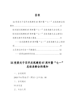 目录XX党委关于召开庆祝建党97周年暨七一总结表彰会的通知.2XX党委庆祝建党97周年暨七一总结表彰大会议程.3XX党委庆祝建党97周年暨七一总结表彰大会主持词4发挥先锋作用筑牢战斗堡垒8——在庆祝建党97周年暨七一总结表彰大会上的讲话.8立足岗位知行合一不断前行..12——获得表彰党员发言12XX党委关于召开庆祝建党97周年暨七一总结表彰会的通知一、会议时间2018年6月XX日(周X)上午XX:00二、会议地点XX会议室三、与会人员党员代表、列席代表(详见附表)四、相关要求1.各党支部书记负责带领本单位与会代表入场,按照指定座位就坐并签到,XX:XX入场完毕;2.与会代表男士着白色短袖衬衣,深色西裤;女士着正装。党员佩戴党员徽章;3.入场后请自觉保持会场秩序,手机置于关闭或静音状态;4.获奖先进集体、优秀党员和优秀党务工作者代表于8:00准时入场。5.各党支部请于6月XX日XX:00之前将与会代表名单报至XX,如有特殊情况不能参会,请提前一天告知。联系人:XXX,电话:XXX。附件:参加XX七一表彰会名额分配表中共XXX委员会2018年6月XX日XX党委庆祝建党97周年暨七一总结表彰大会议程一、时间2018年6月XX日(周XX)上午XX:00二、地点XX会议室三、大会议程1.奏(唱)《国歌》;2.重温入党誓词;3.宣读《关于表彰2017-2018年度党内先进集体和优秀个人的决定》;4.为获奖的先进集体和优秀个人代表颁奖;5.先进代表交流发言;6.领导讲话;7.奏《国际歌》。XX党委庆祝建党97周年暨七一总结表彰大会主持词XXX(2018年6月XX日)开会前,由XXX同志宣读会议应急预案。同志们:今天,我们在这里隆重召开庆祝建党97周年暨七一总结表彰大会,回顾总结一年来党建工作取得的新进展、新突破、新成果,表彰先进、鼓舞士气、激励干劲,进一步动员广大党员干部坚定信念,团结奋进,立足岗位,勇挑重担,为全面完成各项任务而努力奋斗!下面,我宣布:XX党委庆祝建党97周年暨七一总结表彰大会现在开始!今天会议有7项议程。首先,进行会议第一项议程:奏(唱)国歌。请全体同志起立。……会议进行第二项议程:重温入党誓词。请各位党委委员到主席台下站立。……会议进行第三项议程:请作业区党委委员XXX同志宣读《关于表彰2017-2018年度党内先进集体和优秀个人的决定》。会议进行第四项议程:为受到表彰的先进单位和优秀个人颁奖。请受到表彰的先进党支部XX党支部、XX党支部、XX党支部上台领奖。请受到表彰的优秀共产党员代表XX、XX、XX、XX、XX、XX上台领奖;请受到表彰的优秀党务工作者XX、XX、XX、XX、XX、XX上台领奖。此外,XX党支部被评为公司红旗党支部,XX党支部被评为公司先进党支部,XX同志被评为公司模范共产党员,XX、XX、XX、XX4名同志被评为公司优秀共产党员,XX同志被评为公司优秀党务工作者。让我们对以上单位和个人表示祝贺。会议进行第五项议程,先进集体和优秀个人代表交流发言。请先进党支部代表XX同志交流发言。请优秀共产党员代表XX同志交流发言。会议进行第六项议程:请党委书记XXX同志讲话。……同志们,今天的会议开得非常好,内容丰富、鼓舞人心、催人奋进,达到了预期效果。刚才,隆重表彰了先进党支部、优秀共产党员、优秀党务工作者等一批先进典型,3名同志分别作了交流发言。XX书记代表作业区党委总结了一年以来党建工作特别是XX品牌建设工作开展情况和取得的成绩,并对下步工作提出了具体要求。结合本次会议精神的贯彻落实,我简单强调三点意见:第一,要高度重视,认真传达并贯彻落实本次会议精神。会后,各党支部要迅速行动起来,党政班子成员先行一步,深刻把握本次会议的精神实质。然后要结合本单位实际,召开支部党员大会,将会议精神传达给每一名党员,进而带动全员,进一步激发全体员工干事创业的积极性、主动性和创造性,充分发挥基层党组织的凝聚力、战斗力和广大党员的先锋模范作用,为XXX提供组织保障。第二,要认真履职,深入推进全面从严治党向基层延伸。要按照集团公司《党建工作责任制实施办法》的相关要求,突出谁主管谁负责,管业务必须管党建的理念,将落实党建责任制同落实岗位责任制和安全生产责任同等对待,认真抓好一岗三责。坚持融入中心,服务大局,深刻理解XX品牌创建的丰富内涵、重要意义和任务目标,深入推进两