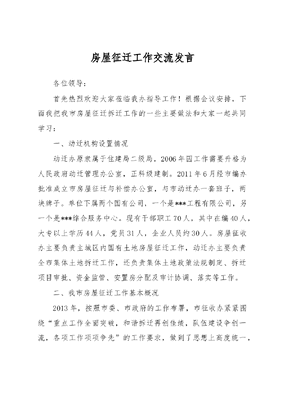 房屋征迁工作交流发言各位领导:首先热烈欢迎大家莅临我办指导工作!根据会议安排,下面我把我市房屋征迁拆迁工作的一些主要做法和大家一起共同学习:一、动迁机构设置情况动迁办原隶属于住建局二级局,2006年因工作需要升格为人民政府动迁管理办公室,正科级建制。2011年6月经市编办批准成立市房屋征迁与补偿办公室,与市动迁办一套班子,两块牌子。单位下属两个国有公司,一个是工程有限公司,另一个是综合服务中心。现有干部职工70人,其中在编40人,大专以上学历44人,党员31人,企业人员约30人。房屋征收办主要负责主城区内国有土地房屋征迁工作,动迁办主要负责全市集体土地拆迁工作,还负责集体土地政策法规制定、拆迁项目审批、资金监管、安置房分配及审计协调、落实等工作。二、我市房屋征迁工作基本概况2013年,按照市委、市政府的工作布署,市征收办紧紧围绕重点工作全面突破,和谐拆迁再创佳绩,队伍建设争创一流,各项工作项项争先的工作要求,做到了思想上高度统一,认识上高度一致,房屋征迁工作快速启动,迅速推进,全年累计完成33个项目153万平方米征迁任务,其中国有土地完成70万平方米,集体土地完成83万平方米。2014年,市委、市政府下达的征迁任务是100万平方米,我们提出了确保完成100万平方米征迁任务,力争完成150万平方米的口号,明确了征迁总量、依法征迁、平安征迁三项指标在徐州市继续保持第一,苏北力争一流,全省处于领先的奋斗目标。按照年初制定的房屋征迁序时计划表,今年共有51个项目列入征迁计划,总建筑面积约150万平方米。其中1-6月份已完成、、、、等17个地块拆迁,建筑面积51.31万平方米,征迁户数2262户。目前正在实施\\等8个项目,建筑面积21万平方米;正在启动4个项目19.1万平方米;下半年计划启动等22个地块,建筑面积58.4万平方米。我市集体土地拆迁实行属地负责制,城区内设置**、**、**、**四个街道办事处,**园区管委会、**经济开发区管委会两个管委会,城区外设置13个镇,每个街道办、管委会、镇均设置房屋拆迁机构并配备专门的拆迁工作人员,全市集体土地拆迁从业人员规模大约在500人左右。目前我市集体土地拆迁的程序及相关政策主要参照国有土地上房屋征收补偿政策执行。集体土地拆迁补偿政策主要有以下几个方面:(1)货币补偿价格:集体土地房屋合法面积按楼房1850元/㎡、平房1750元/㎡、瓦房1500元/㎡进行补偿。拆除违法建筑,依法不予补偿。(2)安置方式:被征收人(搬迁人),合法建筑面积范围内每户最多安置2套房屋。房屋合法建筑面积与安置房建筑面积等同部分,实行互找差价,不同房屋结构,按楼房130元/㎡、平房180元/㎡、瓦房230元/㎡补缴安置标准面积部分的差价(不含楼层差)。(3)附属物补偿标准:实行打包政策,不区分楼房、瓦房、平房,每户按其合法建筑面积予以380元/㎡补偿。这样做可以有效降低突击装修,避免造成资源浪费。(4)搬迁补助费:按合法建筑面积20元/㎡标准执行。(5)临时安置补助费:按合法建筑面积每平方米6元补助。选房顺序:实行谁先签订房屋搬迁补偿安置协议的,谁优先选择、购买安置房。奖励期限:在征收决定公告规定的期限内,按签订协议约定的期限,腾空房屋交付拆除的,按其合法建筑面积及交房时间给予一定奖励。其中:房屋征收决定公告发布后1-10天签订协议的,给予200元/㎡奖励;11-20天签订协议的,给予150元/㎡奖励;21-30天签订协议的,给予100元/㎡奖励,征收决定公告30日后不予任何奖励。三、主要工作措施(一)领导高度重视,周密安排部署市委、市政府坚持以人为本、拆建并重、和谐发展的指导方针,紧紧围绕政府工作报告中对全市人民作出的承诺,着眼于经济社会的协调、长远发展,全面启动了城建重点工程、民生工程、棚户区、城中村拆迁改造工作。市委市政府主要领导和分管领导高度重视房屋征迁工作,多次亲临现场指挥调度,现场解决有关工作难题。市政府成立了双拆督查领导小组,多次召开全市房屋征迁推进大会和领导小组工作会议,及时协调解决工作中遇到的各类问题,为房屋征迁工作的快速高效推进提供了坚实的组织领导基础。根据我市城市建设发展的实际情况,市委、市政府提出了打造园林城市这一奋斗目标,把城市房屋征迁改造和棚户区改造作为改善城市面貌、提高城市品位的切入点,并将棚户区、旧城区、城中村改造和重点工程建设房屋征迁列入重点工作计划,既解决棚户区和城中村改造问题,同时,又解决了城市环境和居民生活环境问题。(二)部门协调配合,主动服务大局在征迁工作中,按照职责分工,市征收办与相关责任单位及各属地街道(镇)加强分工协作,相互支持配合。征收办牵头负责,抓总体规