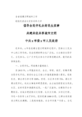 全省创建文明城市工作经验交流会议发言材料之四倡导全民守礼办好民生实事共建共促共享城市文明中共x市委x市人民政府近年来,x市在创建全国文明城市过程中,坚持以人民为中心的工作导向,突出创建的群众性广泛性,大力推动全民守礼、全民参与,让广大市民在参与中共享创建成果。我们的具体做法是:一、全民守礼,用道德力量感染人自2015年,x市就在机关、企业、学校、社区、村镇开展全民守礼行动,推动社会主义核心价值观落细落小落实。党政机关、事业单位参与率100%,农村、社区参与率75%。通过开展全民守礼,机关办事效率明显提高,企业诚信经营成为风尚,社区、农村邻里和谐蔚然成风。一是广泛宣传。在媒体开办专题栏目,在城乡建设家训文化馆、礼仪文化墙、乡村记忆馆、守礼一条街等1.8万多处,组织巡演1000余场,让群众处处接受文明礼仪熏陶。二是找准载体。在全市开展书香x、全民诵经典活动,连续12年举办过端午佳节、诵中华经典、做有德之人活动,连续10年举办过大年、谢父母孝老敬亲活动,连续8年举办孝贤模范评选,先后10次在中央文明办举办的全国培训班上介绍经验。三是五礼并举。针对机关人员、企业人员、社区居民、农村居民、青少年等不同对象,开展有针对性的守礼活动,守敬业之礼,建设服务型机关;守友善之礼,建设和谐社区;守崇德之礼,建设文明校园;守诚信之礼,建设信用企业;守孝贤之礼,建设孝贤农村。四是四级联动。出台《全民守礼行动实施意见》,动员市、县、乡、村四级联动,推动全民守礼行动进基层。注重典型带动,做到每镇都有示范村,每村都有文明户,让群众深切感受到守礼才能受尊重,有礼才能有好报。二、立足群众,用民生实事造福人创建依靠群众,创建为了群众。x市在创建文明城市过程中,坚持把与老百姓衣食住行等民生问题放在首位,不断增强群众的获得感、幸福感。一是加快城市建设,让市民生活称心。新建改造117条道路、7座沙澧河大桥,整治背街小巷923条,新建公厕200座。升级改造道路照明64条,新安装路灯5493盏,实现大街小巷照明全覆盖。投资1.2亿元购置环卫机械作业车辆280台,适合道路机扫率达到100%。二是整治七小门店,让市民吃饭放心。针对制售小食品、小餐饮门店卫生条件差、质量隐患多等问题,开展集中攻坚行动、专项清理行动,6900多家七小门店环境、设施普遍提升,七小门店整治被评为2015年度群众最满意的民生实事一等奖。三是改造老旧小区,让市民居住舒心。采取开发企业回头整治、文明单位帮扶整治、自建小区自行整治和各区政府兜底整治四种整治模式,投资1.08亿元对全市996个老旧小区进行改造提升。推行社会化、市场化、专业化的简易物业管理,物业费由业主、市、区财政三方各分担5元共同承担,所有老旧小区全部实施物业服务,惠及群众85990户。积极改造城市旧城区、棚户区和城中村,完成房屋征收600万平方米,建设安置房260万平方米。城区内340家废品收购站和775家养殖场全部外迁。四是开展全民健身,让市民愉悦身心。提出10分钟健身圈健身理念,建设100个街心游园和5处全民健身活动中心,市民出门10分钟之内能找到健身场所。125个小区建有健身广场,配套安装各类健身器材950件。建设多功能运动场6个,建成河南省唯一的国家级体育公园——沙澧国家体育公园。五是发展公共交通,让市民出行顺心。投资近6000万元,购置130台节能和新能源公交车,优化公交线路,降低公交车费,围绕一轴、两环、七线,建设城市自行车绿道30多公里,设置108个公共自行车服务点,引导广大市民绿色出行。三、健全机制,用刚性制度约束人规范市民行为,提升文明素养,既需要长期教育引导,也离不开制度约束,和市民自我管理、自我监督。x市先后制定两城同创工作考评办法、奖惩资金管理办法、市民有奖举报办法、城市网格化管理考核办法等工作制度,建立周督导、月排名、季讲评、半年奖惩、年终总评的督导考评机制,促进文明城市创建工作高效开展。如城市网格化管理,每个网格配备一长五员(网格长、卫生监督员、城管监督员、环保监督员、七小监督员、文明宣传员),对网格内秩序、卫生、环保、门店和市民教育进行管理和监督,哪个网格出现问题,处罚网格长和相应管理人员。建立了微信投诉平台,市民只要举报车窗抛物、暴露垃圾、敞口垃圾池、旱厕、未封闭的垃圾道,就可获得50—100元奖金,极大调动了市民参与创建的积极性。对车辆乱停乱放、行人闯红灯现象,一周一曝光,既通报批评又经济处罚,有效遏制了不文明行为。创建文明城市活动开展以来,市政府每年拿出2000多万元,奖励创建工作先进单位、热心市民,极大调动基层创建积极性。创建全国文明城市是强者与强者之间的激烈竞争,与先进城市相比,x市还存在创建标准不高、工作责任不实、突出问题整治不够彻底等问题。我们将以此次会