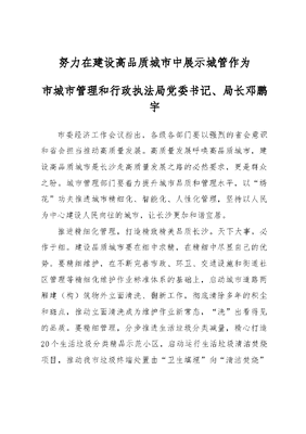 努力在建设高品质城市中展示城管作为市城市管理和行政执法局党委书记、局长邓鹏宇市委经济工作会议指出,各级各部门要以强烈的省会意识和省会担当推动高质量发展。高质量发展呼唤高品质城市,建设高品质城市是长沙走高质量发展之路的必然要求,更是群众之盼。城市管理部门要着力提升城市品质和管理水平,以绣花功夫推进城市精细化、智能化、人性化管理,坚持以人民为中心建设人民向往的城市,让长沙更加和谐宜居。推进精细化管理,打造精致精美品质长沙。天下大事,必作于细。建设品质城市要在细中求精,在精细中尽显自己的优势。要精细维护,在不断完善市政、环卫、交通设施和街道社区管理等精细化维护作业标准体系的基础上,启动城市道路两厢建(构)筑物外立面清洗、翻新工作,彻底清除多年的积尘和斑点,推动立面清洗成为维护作业新常态,洗出看得见的品质。要精细管理,分步推进生活垃圾分类减量,精心打造20个生活垃圾分类精品示范小区,启动运行生活垃圾清洁焚烧项目,推动我市垃圾终端处置由卫生填埋向清洁焚烧升级,继续加强餐厨垃圾收运处置全覆盖,保持餐厨垃圾处理在全国的先进地位。要精细执法,针对各类影响城市面貌和市民生活的乱象开展专项整治行动,建立违法广告、招牌、建筑清单,摸清城市家底,实施清单式拆除,真正让城市整洁、靓丽起来。要精细提质,按照精致精美标准,高质量推进主次干道、支路街巷、老旧社区等提质改造,进一步推进主城区夜景亮化建设,围绕特色打造城市,建设一批都市园艺社区、特色风貌街巷,既要展示现代化风味,又要体现老长沙风格。用工匠精神提升城市品质,将精致、精细、精美、文明的品质精神体现在城市的每个细节。推进智能化管理,打造五位一体智慧城管。中央城市工作会议提出,要着力打造智慧城市,加快数字化城市管理向智慧化升级,实现感知、分析、服务、指挥、监察五位一体。要加强城市管理数字化平台建设和功能整合,加快形成用数据说话、用数据决策、用数据管理、用数据创新的城市治理新方式,推动智慧城市建设取得实效。一方面,要强化智慧管理,基于城市管理网格化平台,加强行政许可、行政处罚、城管考核等城市管理全要素数据的采集、整合和分析,善用大数据治脏、治乱、治差,促进多部门公共数据资源互联互通和开放共享,为网格内群众提供一站式服务。另一方面,要强化智慧执法,加快城市管理和综合执法档案信息化建设,依托信息化技术,综合利用视频一体化技术,探索快速处置、非现场执法等新型执法模式,提升执法效能。推进人性化管理,打造宜居宜业美好家园。把长沙建设成为美好家园,是中央、省委和市委的要求,也是人民群众的期待。城市管理部门要发挥担当精神,大力推进人性化管理,致力于让长沙更加宜居、更有温度。人性化就是尊重人的本性,要坚持以人为本,把城市管理工作抓小、抓细、抓具体,让群众的衣、食、住、行更加舒适。要让小区更加宜居,在两年提质100个老旧社区的基础上,继续加大投入,抓好50个老旧社区提质提档工作,将人性化理念贯穿到提质建设中,让城市充满人情味和幸福感。要让道路更加宜行,坚持行人优先,持续开展人行道整治,清除影响行人通行的亭棚、箱柜、杆线、设施等障碍,提升人行道品质,深入开展城管、交警联合执法,大力整治占用人行道停车乱象,做到还路于行人。要让城市更加宜游,加强景区、风光带、商圈等重点区域执法整治,营造良好的市容秩序,积极开展厕所革命,打造一批示范性公厕,让居民和游客享受到舒适方便的城市环境,从细微处体现人性化、人情味和人文精神。
