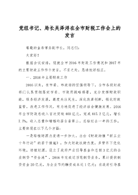 党组书记、局长吴泽浔在全市财税工作会上的发言尊敬的金寿常务副市长,同志们:大家好!根据会议安排,现就全市2016年财政工作情况和2017年的主要财政工作作个发言,不妥之处,恳请批评指正。一、2016年主要财政工作2016以来,在市委、市政府的坚强领导下,全市各级财政部门认真贯彻落实市委、市政府战略部署,充分发挥财政职能,服务经济发展,高度关注民生,深化改革创新,强化财政监管,改进工作作风,有力地促进了经济社会健康发展。2016年全市财政总收入首次突破400亿元,完成415.2亿元,增长7.7%,收入总量和增幅均居全省第二。总结过去一年的工作,主要体现在以下几个方面:一是培植财源力度进一步加大。出台《财政助推新工业十年行动的若干措施》,加大财政扶持力度,多管齐下优化环境,培植财源。设立了政府产业引导基金和总额3亿元的企业倒贷资金池,2016年完成近百笔倒贷业务,累计提供倒贷资金20亿元,为企业节约融资成本近1亿元;在政府引导基金下设立规模1亿元的科技创业投资子基金,重点支持传统产业转型升级。通过财园信贷通累计放贷233.96亿元,惠及全市中小微企业5265户次。其中,2016年新放贷款102.6亿元,超额完成年初制定的90亿元放贷目标,放贷总量连续四年保持全省第一。在财园信贷通平台基础上,开通了创业创新贷,帮助创业创新小微企业申请获得流动资金贷款支持,引导更多人尤其是青年人投身到大众创业、万众创新队伍中来。市财政信用担保公司全年为全市11家企业担保贷款6.01亿元。这些措施有效地缓解了融资难、融资贵问题,为企业发展注入了活力。二是民生投入力度进一步加大。2016年全市财政支出完成465.5亿元,同比增长5.1%,其中民生类支出共计完成359.5亿元,占财政总支出的77.2%。三是创新理财力度进一步加大。组织全市各级财政部门开展深化改革精细管理年活动,着力建立优化资源配置、维护市场统一、促进社会公平的现代财政制度。上线了全市公务消费一体化监管平台,运用制度+科技手段强化三公经费监管;营改增试点改革顺利实施;在九江财政网搭建预决算公开统一平台,主动接受社会公众监督;盘活财政存量资金1.6亿元;升级完善财税综合信息平台,累计通过平台查补税款13.97亿元;扩大政府购买服务试点范围,购买资金达4109万元;全市通过政府采购节约资金2.99亿元;推行农业三项补贴改革,下达补贴资金4.55亿元,切实为农民减负;全面推进财政数据仓库、OA办公自动化系统等信息化应用系统,形成以财政业务为主线、以规范管理为目的、以信息化建设为抓手的智慧财政监管体系。四是财政监管力度进一步加大。对政府性投资项目实施财政评审,全市节约财政资金16.87亿元;通过财政绩效评价,收回项目资金500万元,个别部门在申报绩效目标过程中主动申报减少2017年预算安排130万元;组织开展全市财政资金安全检查,贯彻执行中央八项规定严肃财经纪律专项检查,会计信息质量检查,民生资金重点检查等,保障财政资金和财政干部两个安全。五是机关建设力度进一步加大。深入开展两学一做学习教育,实现学习教育全员覆盖,。扎实推进党建+工作,深化党建+互联网思维,在市直机关率先搭建党建在线学习和工作展示平台。切实加强干部培训,提升财政干部履职能力。持续开展走亲连心,帮助结对帮扶的困难家庭解决上学难、看病难、住房难问题。大力抓好廉政建设,推动两个责任落地生根。加强机关文化建设,市财政局被全国总工会授予全国模范职工之家。在看到成绩的同时,我们也清醒地看到财政工作中存在着诸多困难和问题:一是受经济下行压力影响,财政收入增长压力较大;二是税收结构不够合理,对个别企业和第二产业的依赖过大,税源基础薄弱;三是面对新形势、新任务,尤其是繁重的财政改革任务,我们在财政收入征管、财政监督和资金绩效管理等方面还存在薄弱环节;四是财政收支矛盾仍然突出。这些问题都将制约我市财政健康运行和发展,我们将在今后的工作中积极采取措施加以解决。二、2017年全市财政工作重点2017年,我们将认真贯彻落实市委十一届三次全会和年初召开的人大、政协两会精神,将思想和行动统一到市委、市政府的决策部署上来,全力服务新工业十年行动和重大项目落实年,以强烈的政治责任感和奋发有为的精神状态,开拓进取,扎实工作,充分履行财政职能,促进全市经济社会健康发展。具体来说,主要抓好以下几方面工作:(一)全力服务发展,力促经济量质齐升继续保持稳中求进工作总基调,落实积极财政政策,进一步完善支持实体经济发展的财税政策措施,提高发展质量和效益,促进经济保持中高速增长、迈向中高端水平;全力支持新工业十年行动,整合市级工业发展资金1.3亿元,千方百计争取上级财政补助资