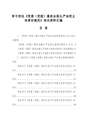 学习传达《党委(党组)落实全面从严治党主体责任规定》相关资料汇编目录一、《党委(党组)落实全面从严治党主体责任规定》全文及传达提纲《党委(党组)落实全面从严治党主体责任规定》全文.3《党委(党组)落实全面从严治党主体责任规定》传达提纲113《党委(党组)落实全面从严治党主体责任规定》传达提纲217二、传达学习《党委(党组)落实全面从严治党主体责任规定》讲话传达学习《党委(党组)落实全面从严治党主体责任规定》讲话1.19传达学习《党委(党组)落实全面从严治党主体责任规定》讲话2.21传达学习《党委(党组)落实全面从严治党主体责任规定》讲话3.23传达学习《党委(党组)落实全面从严治党主体责任规定》讲话4.26传达学习《党委(党组)落实全面从严治党主体责任规定》讲话5.28三、学习《党委(党组)落实全面从严治党主体责任规定》研讨发言坚持压力传导落实主体责任——学习《规定》研讨发言31一级带一级层层抓落实——学习《规定》研讨发言.34一级带一级层层抓落实——学习《规定》研讨发言.37强化担当意识落实主体责任——学习《规定》研讨发言40切实担起管党治党主体责任——学习《规定》研讨发言43四、学习《党委(党组)落实全面从严治党主体责任规定》体会文章以三个注重为统领全面落实从严治党主体责任..45落实党委主体责任筑牢责任担当意识..48抓实抓细主体责任53落实主体责任坚守使命担当.58全面从严治党落实四个着力61党委(党组)落实全面从严治党主体责任规定全文第一章总则第一条为了全面落实党委(党组)全面从严治党主体责任,推动全面从严治党向纵深发展,根据《中国共产党章程》和有关党内法规,制定本规定。第二条本规定适用于地方党委和按照《中国共产党党组工作条例》设立的党组(党委)。党的纪律检查机关、党的工作机关、党委直属事业单位在本单位落实全面从严治党主体责任,党的基层组织落实全面从严治党主体责任,参照本规定执行。第三条党委(党组)必须深入贯彻习近平新时代中国特色社会主义思想,增强四个意识、坚定四个自信、做到两个维护,不忘初心、牢记使命,守责、负责、尽责,一以贯之、坚定不移全面从严治党,以伟大自我革命引领伟大社会革命,以科学理论引领全党理想信念,以两个维护引领全党团结统一,以正风肃纪反腐凝聚党心军心民心,永葆党的先进性和纯洁性,确保党始终成为中国特色社会主义事业的坚强领导核心。第四条党委(党组)落实全面从严治党主体责任,应当遵循以下原则:(一)坚持紧紧围绕加强和改善党的全面领导;(二)坚持全面从严治党各领域各方面各环节全覆盖;(三)坚持真管真严、敢管敢严、长管长严;(四)坚持全面从严治党过程和效果相统一。第五条中央和国家机关在全面从严治党中具有特殊地位和作用,必须在落实全面从严治党责任中走在前、作表率,全面提高机关党的建设质量,建设让党中央放心、让人民群众满意的模范机关,引领带动各地区各部门抓好全面从严治党。第二章责任内容第六条地方党委应当将党的建设与经济社会发展同谋划、同部署、同推进、同考核,加强对本地区全面从严治党各项工作的领导。主要包括:(一)坚决维护以习近平同志为核心的党中央权威和集中统一领导,坚决贯彻执行党中央决策部署以及上级党组织决定;(二)在本地区发挥总揽全局、协调各方的领导作用,在经济社会发展各项工作中坚持和加强党的全面领导,在同级各种组织中发挥领导作用;(三)把党的政治建设摆在首位,坚定政治信仰,强化政治领导,提高政治能力,净化政治生态,始终在政治立场、政治方向、政治原则、政治道路上同党中央保持高度一致;(四)把党的思想建设作为基础性建设来抓,坚定理想信念,用习近平新时代中国特色社会主义思想武装头脑、指导实践、推动工作,落实意识形态工作责任制;(五)贯彻新时代党的组织路线,坚持民主集中制,树立和坚持正确选人用人导向,建设