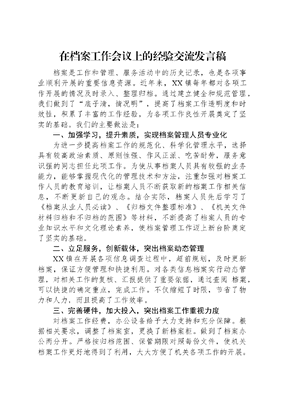 在档案工作会议上的经验交流发言稿档案是工作和管理、服务活动中的历史记录,也是各项事业顺利开展的重要信息资源。近年来,XX镇每年都对各项工作开展的情况及时录入、整理归档。通过建立健全和规范管理,我们做到了底子清,情况明,提高了档案工作透明度和时效性,积累了丰富的工作经验,为各项工作良性开展奠定了坚实的基础。我们的主要做法是:一、加强学习,提升素质,实现档案管理人员专业化为进一步提高档案工作的规范化、科学化管理水平,选择具有较高政治素质、原则性强、作风正派、吃苦耐劳,服务意识强的同志担任此项工作。为使从事档案人员具有较强的业务能力,能够掌握现代化的管理技术和方法,注重加强对档案工作人员的教育培训,让档案人员不断获取新的档案工作相关信息,不断更新自己的观念。结合实际,档案人员先后学习了《档案从业人员必读》、《归档文件整理标准》、《机关文件材料归档和不归档的范围》等材料,不断提高了档案人员的专业知识水平和文化理论素养,使档案管理工作迈上新台阶奠定了坚实的基础。二、立足服务,创新载体,突出档案动态管理XX镇在开展各项信息调查过程中,超前规划,及时更新档案,保证方便管理和快捷利用。对各类信息档案实行动态管理,对相关工作的复核、汇报提供了重要依据,通过查阅 档案,可以快捷的确定重点,完成工作。不仅缩短了时限,节省了物力和人力,而且提高了工作效率。三、完善硬件,加大投入,突出档案工作重视力度对