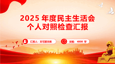 2025年度民主生活会个人对照检查汇报汇报人:文可居文库文稿:4800 字前言QIAN YAN根据本次民主生活会要求,紧紧围绕深入学习贯彻习近平新时代中国特色社会主义思想,全面贯彻落实党的二十届四中全会精神,深入贯彻落实习近平总书记重要讲话和重要指示批示精神,以打攻坚战、持久战的决心和恒心,锲而不舍落实中央八项规定精神,推进作风建设常态化长效化,以优良作风凝心聚力、真抓干,聚焦高质量发展首要任务,扎实推进中国式现代化,为实现十五五良好开局奠定坚实基础这一主题,在深入学习研讨、广泛征求意见、开展谈心谈话的基础上,重点围绕五个带头方面,把自己摆进去、把职责摆进去、把工作摆进去,深入查摆自身存在的差距和不足,深刻剖析问题根源,明确了今后的努力方向和整改措施。02存在的主要问题03问题原因剖析01会前学习的收获体会04今后努力方向与整改措施目录MU LU会前学习的收获体会第一部分一、会前学习的收获体会会前,通过集中研讨与个人自学,系统学习了习近平新时代中国特色社会主义思想和党的二十届四中全会精神。党和国家事业取得新的重大成就,根本在于以习近平同志为核心的党中央领航掌舵,在于习近平新时代中国特色社会主义思想科学指引。政治信念更加牢固,四个意识持续增强,四个自信更加坚定,两个维护的自觉性和坚决性进一步提升。作为新时代的党员领导干部,必须要坚定理想信念,始终胸怀国之大者