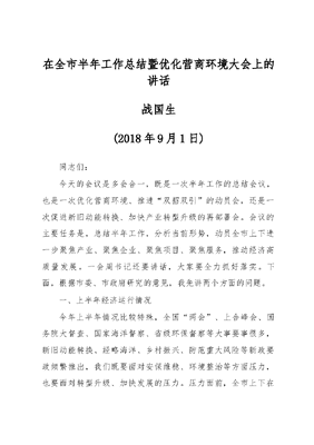 在全市半年工作总结暨优化营商环境大会上的讲话战国生(2018年9月1日)同志们:今天的会议是多会合一,既是一次半年工作的总结会议,也是一次优化营商环境、推进双招双引的动员会,还是一次促进新旧动能转换、加快产业转型升级的再部署会。会议的主要任务是,总结半年工作,分析当前形势,动员全市上下进一步聚焦产业、聚焦企业、聚焦项目、聚焦服务,推动经济高质量发展。一会周书记还要讲话,大家要全力抓好落实。下面,根据市委、市政府研究的意见,我先讲两个方面的问题。一、上半年经济运行情况今年上半年情况比较特殊,全国两会、上合峰会、国务院大督查、国家海洋督察、省级环保督察等大事要事很多,新旧动能转换、经略海洋、乡村振兴、防范重大风险等新政要政频繁推出,我们既要面对安保维稳、环境整治等方面压力,也要面对转型升级、加快发展的压力。压力面前,全市上下在市委的坚强领导下,咬定目标,扎实工作,推动全市经济呈现出很多积极变化和向好态势。主要有5个明显特点:一是经济发展质量继续向好。无论总量指标还是结构指标,整体呈现稳健发展、质量趋优的态势。上半年,地区生产总值增长7.2%,外贸进出口增长6.5%、高出年初计划1.5个百分点;一般公共预算收入增长9%、占年初预算的64.1%,尤其是财税质量指标明显优化,税收收入占一般公共预算收入的比重达到83.1%,同比提高2个百分点,比威海市平均增幅高5.9个百分点,四税收入增长152%,占税收收入的比重达到38.2%,同比提高21.3个百分点。二是产业定位和推进路径更加清晰。结合高质量发展、新旧动能转换等形势变化,修订了11个领域的扶持政策,抓住关键少数产业集中发力,确定了3+3产业体系,围绕装备制造、食品加工、纺织服装三个传统产业的存量提升、改造升级,新能源、大数据与人工智能、大健康三个新兴产业的无中生有、有中出新,专门理顺了招商引资体制机制意见,着力培育特色产业、立市产业;规划了新能源(汽车)科技产业园,正在规划大健康和大数据等产业园区,作为新旧动能转换的主战场。通过聚焦政策、聚焦产业、聚焦企业、聚焦园区,上半年工业经济展现出更强动能,规上工业增加值增长8.8%、高出年初计划1.3个百分点,工业用电量增长6.1%,两项数据在威海市均处于领先地位。三是项目层次有了较大提升。改变传统的单纯给予土地、税收等政策优惠的招商模式,创新重资本、轻资产的招商模式,引进落地了星宜新材料、泛海阳光新能源等一批新兴产业项目,上半年新开工投资过亿元项目22个,其中工业项目占比73%,项目规模、科技含量、市场前景明显好于往年,产业项目低质化问题得到有效改观。四是综合改革取得显著成效。全国农村综合改革试点得到各级高度肯定,省财政厅将于10月中旬在我市组织召开现场会;鲁担惠农贷试点全面推进,省农担公司将在威海召开现场会推广乳山经验;简政放权、流程再造、资源整合等放管服改革扎实推进,行政许可事项数量压减46.1%、办理时限压缩44.7%,68个政务事项可在镇街一站式办理,26个重点领域可开展红黑名单认定。五是重大基础设施相继破题加快推进。通过规划谋划引领、全力跑上对接,莱荣高铁、乳山口大桥、乳山港、通用机场、文莱高速等一批事关未来发展的重大基础设施项目推进顺利,其中,莱荣高铁完成了线形规划和场站选址,乳山口大桥年底前将动工建设,对接青烟威、联通中西部的立体化交通格局成为可能,将从根本上解决制约我市发展的交通瓶颈问题,为乳山弯道超车、跨越发展奠定了坚实基础。二、下半年工作任务和重点下半年,全市经济工作总的要求是坚持目标导向、问题导向,查漏补缺,集中攻坚,确保全年任务圆满完成。目标导向就是年初经济工作会、人代会等确定的事项,也是市委、市政府年度工作重点中提出的事项,更是上级新旧动能转换、三大攻坚战、乡村振兴、经略海洋等战略中部署的事项;问题导向就是要对照目标回头看,找出工作中的差距和短板,明确努力方向和工作重点,向全市人民交上一份满意的答卷。从全市层面看,要着力解决好制约发展的七个问题:(一)解决好产业和园区定位不够精准的问题。重点抓好四个方面工作:一是抓好重点产业的定位和推进。结合上半年外出考察学习,市委、市政府确定不再搞六大产业八大产业的数字游戏,要聚焦有基础、有潜力的少数关键产业,提出了3+3产业体系,聚焦有限要素,实施精准发力,努力打造未来的特色产业、立市产业。在产业发展上重点建立两套推进体系,一个是政策保障体系,就是产业办公室+产业规划+园区规划+配套政策,一个产业落实一班专职人员、制定一个产业规划、明确一个园区承载、配备一套扶持政策;第二个是产业导入体系,就是专业园区+龙头企业+产业基金+创新平台,每个产业要明确一个专业园区,力争引进一个龙头项目,组建一支产业基金,引进相关科研机构和研
