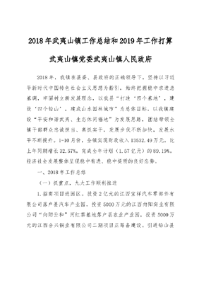2018年武夷山镇工作总结和2019年工作打算武夷山镇党委武夷山镇人民政府2018年,我镇在县委、县政府的正确领导下,坚持以习近平新时代中国特色社会主义思想为指引,始终把握稳中求进总基调,牢固树立新发展理念,以我县打造四个基地,建设四个铅山,建成山水园林城市为总体目标,以我镇建设平安和谐武夷、生态休闲福地为发展思路,团结带领全镇干部群众忠诚担当、真抓实干,发展步伐不断加快,发展水平不断提升。1-10月份,全镇实现财政收入13532.49万元,比上年同期增长32.57%,完成全年计划(1.57亿元)的89.19%。经济社会发展整体呈现稳中有进、稳中提质的良好态势。一、2018年工作总结(一)抓重点,九大工作顺利推进1.招商项目进园区。投资2亿元的江西宝祥汽车零部件有限公司落户县汽车产业园,投资5000万元的江西向阳实业有限公司向阳云和河红茶基地落户县农业产业园,投资5000万元的江西合兴铜业有限公司二期项目正筹备建设。引进铅山县合鑫废旧物资回收经营部、上饶市合丰供应链管理有限公司、上饶市泽远危货运输等7家商贸物流企业已纳税550万元。2.秀美乡村新景象。发挥双遗地名片效应,2018年11月3日由县委、县政府主办,县农业局、县教体局、县旅发委、县文联、武夷山镇政府承办,在我镇篁村村成功举办了2018铅山河红茶品鉴会,观看直播上饶达18.2万人次,多加主流媒体关注报道。秀美乡村建设持续加快,13个省点已完成90%,21个县点已完成95%,共大林场已建设为具有江西共大文化特色的秀美乡村示范校区。乡村旅游呈现新势态,积极向国家住建部推荐西坑村草坪为美丽乡村共同缔造工作优秀案例。3.城乡环境再加强。加大省级文明城市和省级卫生乡(镇)创建工作,全民携手共建形成了良好的氛围。实施垃圾清理和外运填埋市场化,2个垃圾转运站、91名农村保洁员、1180个垃圾收集桶等相关监管运行措施,全镇主要公路、道路、河流等城乡环境卫生整洁有序。4.脱贫攻坚抓精准。开展脱贫攻坚春季攻势、夏季整改、秋冬会战活动,资料建设规范化、村工作室建设五同步,红茶产业扶贫、光伏扶贫、金融扶贫和干部结对帮扶全覆盖,贫困户实现了两不愁,三保障。全镇现有贫困户262户741人,已脱贫户138户423人、未脱贫户124户318人。省定贫困村篁村村贫困户11户36人,2017年已全部脱贫,各项脱贫指标已全部完成,篁村村将在今年整村脱贫退出。5.宅改工作促落实。认真贯彻执行《上饶市农村居民住房建设管理条例》,违章建房现象得到有效遏制。全面推进农村宅基地改革,全镇共退出宅基地3万多平方米,其中有偿退出320户、2万多平方米,无偿退出100多户、1万多平方米;对使用面积超180平方米的,按5元/㎡的标准收取土地有偿使用费。6.土地开发抓进度。实施土地开发建设470亩,其中实施土地开发新增耕地380亩,已验收200亩,其它的正报市国土资源局立项请示;实施城乡建设用地60亩,已完成100亩且已验收;实施旱地改水田60亩,已施工完成待验收。7.殡葬改革显成效。大力倡导移风易俗,积极推进绿色殡葬建设。全镇棺木存量1338具,回收1317具。清理三沿六区坟墓38个。7个村级、1个村联建、1个镇集中公益性墓地已建设完成。殡葬改革零点行动后火化亡故人员43人,实现棺木处置率、火化率、入葬公墓率三个100%。8.集体经济助发展。全镇10个行政村采取国有资源共营模式,做足做活了山水田文章,实现国有与集体的双赢,国有、集体与群众共富,各村级集体经济收入均实现5万元以上,其中篁村村村级集体经济预计可达12万元。9.教育迎国检通过。武夷山中学、武夷山中心小学和黄岗山学校加强基础设施、校园周边环境整治和软件资料建设,校风校貌明显改善,教育质量明显提升,农村生源明显回流,顺利通过了义务教育发展基本均衡国家督导检查,受到上级检查组的好评。(二)抓项目,民生工程建设加快对接农垦发展项目,2017年1个垦区红茶产业化建设项目已完成、1个垦区国有贫困农场标准化茶园扶贫建设项目正在实施、6个农垦小区建设项目基本完成。2018年新争取垦区棚户区改造配套基础设施建设项目11个,其中5个项目已开工、6个项目正在办理项目招投标手续。认真抓实农垦国有土地确权登记发证工作,积极推进农垦改革和农垦集团组建工作。加强基础设施建设,紫桐线公路改建和公路等级升级项目立项已经启动,共大稍仓至石垅王家坞公路项目正在评估。岑源村北山小桥、车盘村水口危桥列入改造计划。王村村大坞安全饮水工程和沙畈村樟坞、岑源村丁家岭、车盘村乌龟山等道路公路硬化项目,以及岑源村、乌石溪堤防工程基本完成。利用好大中型水库后扶结余资金,进一步完善水库移民基础设施建设。(三)抓环境,生态文明持续提升打好污染防治攻