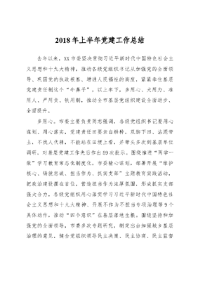 2018年上半年党建工作总结去年以来,XX市委坚决贯彻习近平新时代中国特色社会主义思想和十九大精神,推动各级党组织书记从加强党的全面领导、巩固党的执政根基、增进人民福祉的高度,紧紧牵住基层党建责任制这个牛鼻子,以上率下,多用心、大用力、准用人、严用责、铁用制,推动全市基层党组织建设全面进步、全面提升。多用心。市委主要负责同志强调,各级党组织书记要用心谋划、用心落实,党建责任田要亲自耕种,双脚下田、沾泥带土,不找人代耕,不能站在田埂上看,并带头多次到基层单位调研,对基层党建工作先后作出59次批示。围绕推进两学一做学习教育常态化制度化,市委精心谋划,部署开展维护核心、铸就忠诚、担当作为、抓实支部主题教育实践活动,把政治建设摆在首位,营造担当作为浓厚氛围,形成抓实支部强大合力,各级党组织用心落实学习习近平新时代中国特色社会主义思想和十九大精神、开展不作为不担当专项治理等9个具体动作,推动四个意识在基层落地生根。围绕坚持和加强党的全面领导,市委多次专题研究,制定出台加强城乡基层治理的意见,健全党组织领导民主决策、民主协商、民主监督工作机制,建立村和社区范围内各类组织主要负责人每年向基层党组织述职制度。大用力。市委强调,必须投入足够的人力物力财力和精力,高位大力下重手,实实在在抓落实。市委高度重视城市、农村两大阵地基层党建,召开城市基层党建工作会议,制定1+2文件,强化街道社区党组织轴心作用,提升抓党建、抓治理、抓服务的能力。市财政今年增投X亿,参照公务员工资标准确定3岗18级,全面落实五险一金,大幅提高社区工作者薪酬待遇,最高可达处级水平。划拨30多亿,启动第二轮结对帮扶困难村工作,抽调2065名干部驻村帮扶1000个村计划投资15个亿,全面启动实施党建阵地三年提升工程,按照不少于300平方米标准建设村级组织活动场所;实施发展青年农民党员15条措施,确保每个村至少有2名35岁以下党员。市委强调,非公企业和社会组织中建立党组织不能讨价还价,党的领导不能出现盲区,必须充分彰显党的政治存在和实体存在。先后制定加强园区楼宇、商圈市场、民办学校等党建工作意见,把建立党组织作为法人登记和年检的重要内容;在49个国家级、市级园区中全部建成1000平方米以上的党群服务中心;推进党组织设置创新,社会组织全面实行在会员单位或理事会党员中建立党组织,文化中心社团联合会党建工作经验在全市推广。准用人。市委强调,加强基层党建,关键是要选准用好基层党组织当家人,让党组织书记腰杆挺起来,首先要把好政治关,首关不过、余关莫论,无论哪个领域,政治不合格的坚决不用。各级党委加强对村级组织换届全过程领导,全面推行党组织书记和村委会主任一肩挑,明确要求村委会成员中党员要超过50%,鲜明提出有曾被判刑等9种情形之一的人一律不能作为候选人。在市级机关内设机构和区直部门全面实行主要负责人担任党组织书记,大力推行高校院系、医院科室、企业车间、工程项目主要负责人担任党组织书记。明确优秀社区党组织书记可转事业编,社区规模较大的可享受处级工资待遇,并定向招录130多名公务员。市委严把党代会代表的政治关、廉洁关、品行关,建立25个部门参加的联审机制,X人被取消代表人选资格,其中市管单位主要负责人65人。严用责。市委明确提出,基层党建工作水流不到头、落实不到底,问题出在水塔压力不够大、履职尽责不到位。我们通过制定党建任务清单、严格述职评议考核、严肃督责追责问责,实施闭环管理。市委常委会每年听取各区各系统党委(党组)书记述职,市委常委、党员副市长分别听取分管部门书记述职,实现基层党建述职评议全覆盖。突出问题导向,连续两年在述职评议会上播放巡查暗访专题片深刻披露问题,述职的书记主动担责直面问题,领导点评见人见事直击问题,两代表一委员现场发言评说问题。市委对党建失责行为,勇于揭开盖子、严肃问责。2017年下半年以来,直接或责成各级党委进行问责的党组织248个,问责党员干部509人,其中局、处级干部124人,形成强力震慑。铁用制。市委强调,必须健全硬制度,采取硬措施,填补硬缺口,完成硬任务。市委制定进一步加强和改善党对高校领导的意见,建立市委和市政府领导同志联系高校、校院领导联系院系和师生党支部制度。十九大后,市委主要负责同志第一时间到所联系的高校宣讲十九大精神,与师生交流互动。市委分别制定制度文件,对科研院所、医疗卫生单位党建工作部署推动,召开专题会议,制定重点任务台账,实施销号管理,逐项跟踪落实。认真贯彻落实全国国有企业党建工作会议精神,60家市管国有企业和86家区管国有企业全部将党建工作要求写入公司章程,全市45家国有上市公司也全部落实了这项要求。市委组织部制定基层党建巡查制度,形成常态化集中巡查和专项督查机制,去年2轮集中巡查共抽查145个