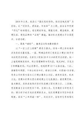 2018年以来,我县以强化党的领导,推动县域发展为目标,以优作风、提效能、作表率为主题,结合全市党建四化标准要求,通过建好阵地、建强支部、建活载体、建硬队伍、建亮品牌的五建措施,推动机关党建水平全面提升、全面过硬。一、聚焦高标,推进活动阵地整体提升以一室三区三保障建设为重点,将每一项工作标准和具体要求定量定型。一室,明确县级部门党委至少建立50平方米的党员活动室,支部至少配备25平方米的党员活动室,统一上墙党建制度清单、积分管理牌等9项内容,规定PVC、亚克力2种牌匾材质,列出投影仪、电视机等12个必备设施。三区,就楼层布局图、干部去向告知栏、承诺公示牌、问题墙+回音壁、党务公开栏等内容在门厅建立服务公示区,就党史国史、机关文化、党建知识等内容在楼道建立文化氛围区,就党建思路、基本情况、具体成效等内容在院落建立固定展示区。三保障,党委配备2名专职党务干部,支部1名,负责做好日常党务工作;健全班子成员包抓党建联系点、包抓党建重点项目和任务制度,落实三单两函一榜、双述双评、目标责任考核等机制,将党建责任下沉压实;按照县委优先保障党建经费的要求,将党建经费优先纳入财政预算。二、聚焦核心,推进支部功能整体提升通过严肃党内政治生活,强化支部领导作用,丰富党建管理措施3个方面,让机关支部真正成为单位的领头羊。一是严肃党内政治生活。逐项细化三会一课、谈心谈话、党日活动、民主(组织)生活会等制度流程、具体要求,划定制度落实的操作标准和规范模板。规定党支部书记和班子成员定期与党员谈心谈话、定期上党课、定期组织主题党日活动、定期开展民主评议党员活动。二是强化支部领导核心。统一制式工作台账和规范文本,建立机关其他组织(工青妇)每季度向支部报告工作制度,规定评优评先必须由支部研究决定,干部纪律作风日常监督、工作日志季度晾晒活动必须由支部领导,执行三项机制必须由支部出具个人政治表现、纪律作风等鉴定意见。三是丰富党建管理措施。坚持重在运用、重在管理、重在实效的原则,加强两台两群的管理使用。即党建云平台、党建信息管理平台,微信互动交流群、QQ党务管理群,建立《党建信息化管理考核办法》。要求每个支部固定1-2名信息管理员,每周进行1次提醒、每旬进行1次督促、每月进行1次通报,实现党建工作在线部署、在线落实、在线督查、在线考核。三、聚焦常态,推进载体效果整体提升拓展党建引领功能,在载体运用上实现有形向有效、有时向经常、浮在面向沉下去转变。一是深化两包一联机制。由机关党组织牵头为村组定规划、定项目、定产业,每周至少组织党员进1次村入1次户,通过宣传政策、走访慰问、精准扶贫、代办服务等措施提升群众的满意度。通过光伏发电、农产加工、特色种植等产业保障脱贫成效,通过改善基础设施、美化人居环境、组织文化活动等工作让群众生活更舒心。二是开展党员进社区、奉献双岗位活动。机关党组织与社区党组织签订城市党建共建协议,将机关党员纳入双重管理,将机关单位资源逐步向社会开放,将党员进社区、奉献双岗位和小岗位、大形象,共产党员在身边活动作为参与城市党建的直接载体,定期组织机关党员进社区参与公益行动,定期举办文艺娱乐等活动,实现组织联建、党员联管、资源联享、活动联办。三是创新三亮三比三评活动。要求机关党员立足本职岗位,在单位公示区、晾岗台公开亮标准、亮身份、亮承诺,相互比技能、比作风、比业绩,每季度举办一次PK赛,评选1次党员示范岗,通过领导点评、党员互评、群众评议的办法,结合党员积分制进行评分,把评分成绩作为年终评优评先、创建党员先锋号、岗位选拔等方面的关键条件。四、聚焦活力,推进党员素质整体提升坚持严管与厚爱结合,激励与约束并重,着力建设一支政治过硬、素质优良、结构合理的党员干部队伍。一是坚持理论武装。结合两学一做学习教育制度化常态化和不忘初心、牢记使命主题教育,运用三会一课、集中轮训、专题讨学、党员讲台等形式,重点学习习近平新时代中国特色社会主义思想和党的十九大精神,确保将新思想新精神学深悟透。二是坚持严管干部。在全县集中开展纪律作风建设年活动的基础上,进一步落实机关党组织管党治党主体责任,根据单位职责和行业性质,逐支部制定更加具体、更能反映自身问题的《纪律作风整顿方案》。由支部领导全覆盖建立干部诚信档案,把干部监督从工作圈向生活圈、亲属圈、社交圈延伸,实现干部监督无死角、无盲点。三是坚持正面激励。以党委为单位建立本系统内关爱、帮扶措施,通过党费支出、申请党内关爱帮扶资金等办法,定期对困难党员干部进行慰问帮扶。将三项机制运用与干部管理信息平台、干部工作日志制度紧密结合,建立党员干部激励名单,将表现突出的作为后备干部进行重点培养。五、聚焦品牌,推