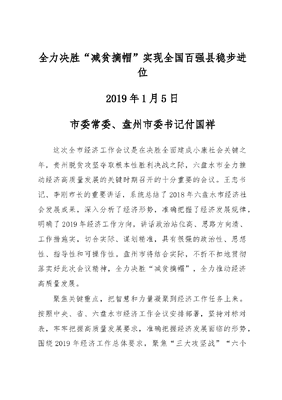 全力决胜减贫摘帽实现全国百强县稳步进位2019年1月5日市委常委、盘州市委书记付国祥这次全市经济工作会议是在决胜全面建成小康社会关键之年,贵州脱贫攻坚夺取根本性胜利决战之际,六盘水市全力推动经济高质量发展的关键时期召开的十分重要的会议。王忠书记、李刚市长的重要讲话,系统总结了2018年六盘水市经济社会发展成果,深入分析了经济形势,准确把握了经济发展规律,明确了2019年经济工作方向,讲话政治站位高、思路方向清、工作措施实,切合实际、谋划精准,具有很强的政治性、思想性、指导性和可操作性。盘州市将结合实际,不折不扣地贯彻落实好此次会议精神,全力决胜减贫摘帽,全力推动经济高质量发展。聚焦关键重点,把智慧和力量凝聚到经济工作任务上来。按照中央、省、六盘水市经济工作会议安排部署,坚持对标对表,牢牢把握高质量发展要求,准确把握经济发展面临的形势,围绕2019年经济工作总体要求,聚焦三大攻坚战六个稳八字方针七项重点任务和民营经济等工作重点,紧密结合盘州经济社会发展实际,认真组织召开专题会议分析研究经济工作,扎实做好发展目标、重点任务、重大举措的制定和落实,把工作任务和要求项目化、具体化,把智慧和力量凝聚到经济发展重点任务上来,咬定目标不放松,细化任务书、制定路线图,科学地干、正确地干、全力地干、大胆地干,全力推动盘州经济工作再上新台阶、开创新局面,实现全国百强县稳步进位。全力决战决胜,把人力和物力聚合到减贫摘帽战役上来。按照六盘水市委两翼先行、中路突破,全面决胜,确保如期全面小康的总体思路,以五先五后攻坚法践行五步工作法,把5个100%作为工作要求、作风要求、纪律要求,全力开展决战30天、夺取全胜脱贫专项行动,坚持以户为核心,把人力和物力向户聚焦、聚集、聚合,在精、准、细、实上下功夫,做到风险排查到位、政策兑现到位、工作落实到位、佐证支撑到位四个到位,强化责任追究和结果运用,把脱贫攻坚问题整改和工作成效与2018年目标奖、机构改革职务调整、村支两委换届提名及工资报酬挂钩,以最铁的纪律、最严的问责、最大的决心坚决夺取减贫摘帽全面胜利。强化组织领导,把心思和精力倾注到全年目标任务上来。牢固树立四个意识、坚定四个自信、做到两个维护,提高政治站位、强化政治自觉,从讲政治的高度研究、分析和推动经济工作,在把好方向、总揽全局、破解难题上下功夫,及时解决经济运行中存在的困难和问题,提高经济发展质量。同时,深化干部培训教育,激励干部担当作为,全面提升驾驭经济发展全局的能力和水平。总之,我们将认真贯彻六盘水市经济工作会议精神,全力决胜减贫摘帽,全面完成各项目标任务,以优异的成绩庆祝新中国成立70周年。以新理念引领新发展在做好一二三产上下功夫2019年1月5日六枝特区党委书记杨昌显在会上聆听了王忠书记、李刚市长的讲话后,总体有三个感受,一是政治站位高,二是研判分析深,三是战略安排准。他们的讲话都体现了务实担当,具有很强的针对性、指导性和可操作性,对我市今年的经济社会发展具有重大的指导意义和现实意义。在今年经济工作中,六枝特区将围绕中央、省、市部署要求,坚持稳中求进工作总基调,以新理念引领新发展,继续在一二三产上狠下功夫,全面落实经济工作的重点任务,加快推进经济高质量发展。坚决做特一产,确保农业稳区目标实现。按照八要素要求,坚持强龙头、创品牌、带农户的发展思路,以农业供给侧结构性改革为抓手,以500亩以上坝区为重点持续加大农业产业结构调整力度,坚持短平快为主、中长期结合、林上林下互动、种养循环、产加配一体,用好用活各类政策,全面推广龙头企业+合作社+农户模式,大力发展猕猴桃、刺梨、茶叶、凉都红樱桃、蔬菜、食用菌、畜禽等主导产业,继续推进小龙虾、大闸蟹等特色养殖发展,调减传统玉米种植面积6万亩,新增种植猕猴桃6万亩、刺梨10万亩、蔬菜23万亩(次),食用菌投产1600亩、特色水产投产3500亩,新增投产产业25万亩以上。依托学生营养餐配送,直供广州、大连等市场,加快推进农产品出山步伐,确保实现一产增加值增长6.8%以上,达到39.9亿元,实现农业稳区目标。坚决做强二产,确保工业强区目标实现。始终把工业发展作为全区经济的重要支柱,深入实施双百工程,着力推进煤矿企业机械化智能化改造,完成30户以上百企改造工程,总投资33亿元以上,实现12家以上百企引进企业进驻。采取一矿一策措施,实现煤矿复工复产18处,力争煤炭产量达到200万吨,持续释放煤炭产能。大力发展新型建材产业,实现水泥产量270万吨以上。深入推进垃圾焚烧发电、煤层气、光伏发电、煤制氢、氢能电池等新能源和清洁能源开发利用,利用煤电+煤气+新能源电力+三套马车快速驱动六枝特区能源