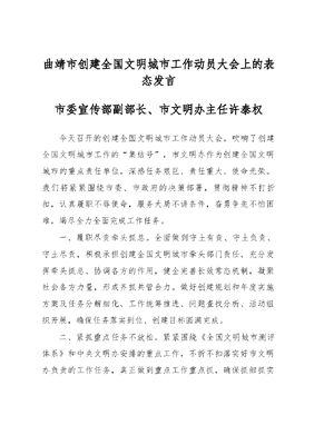 曲靖市创建全国文明城市工作动员大会上的表态发言市委宣传部副部长、市文明办主任许泰权今天召开的创建全国文明城市工作动员大会,吹响了创建全国文明城市工作的集结号,市文明办作为创建全国文明城市的重点责任单位,深感任务艰巨、责任重大、使命光荣。我们将紧紧围绕市委、市政府的决策部署,贯彻精神不打折扣,认真履职不辱使命,服务大局不讲条件,奋勇争先不怕困难,竭尽全力全面完成工作任务。一、履职尽责牵头抓总。全面做到守土有责、守土负责、守土尽责,积极承担创建全国文明城市牵头部门责任,充分发挥牵头抓总、协调各方的作用,健全完善长效常态机制,凝聚社会各方力量,形成齐抓共管合力。做好创建规划和年度实施方案及任务分解细化、工作统筹推进、问题查找分析、活动组织开展,确保任务落实到位、创建目标圆满完成。二、紧抓重点任务不放松。紧紧围绕《全国文明城市测评体系》和中央文明办安排的重点工作,不折不扣落实好市文明办负责的工作任务,真正做到重点工作重点抓,确保抓细抓实抓出成效。扎实做好社会主义核心价值观宣传和普及,推进社会公德、职业道德、家庭美德和个人品德教育,深入组织开展文明交通、文明引导、文明餐桌活动。广泛开展学雷锋、三关爱志愿服务活动,深化做一个有道德的人主题活动,大力加强未成年人思想道德建设。组织开展我们的节日主题活动,做好道德模范、身边好人的评选表彰和学习宣传。认真办好《曲靖文明网》,大力传播网络文明。着力实施文明单位、文明行业、文明村镇、文明校园、文明家庭等群众性精神文明创建活动,夯实文明细胞。三、突破难点补齐短板。针对部分市民存在的不文明行为和生活陋习,制定《文明曲靖20条》组织实施市民素质提升行动,以群众性思想教育和道德实践活动为载体,引导全市干部群众形成爱国守法、明礼诚信、团结友善、勤俭自强、敬业奉献的精神风貌和行为规范,不断提高市民素质,努力把曲靖建设成为友善之市、文明之城、礼仪之邦。广泛宣传普及文明城市创建知识,提升市民的知晓率和支持率。组织各级干部和广大志愿者深入村镇、社区,加强文明督导,引导市民争做讲文明有礼貌、讲道德守秩序、讲友爱促和谐的实践者和传播者,争当文明人,共创文明城。文明创建无止境。开局就是决战,起步就是冲刺,责任就是担当、信任就是动力,我们将把创文重任紧紧扛在肩上,始终牢记在心上,全面落实到行动上,持续推动创建工作向更高目标、更高层次、更高水平迈进,为实现创建全国文明城市目标做出应有的贡献!市委教育工委书记、市教育局党组书记、局长杨学智创建全国文明城市意义重大、使命光荣。我们将认真贯彻落实本次会议精神,强化执行落实意识,提高执行落实能力,加大执行落实力度,增强执行落实成效,始终保持满怀朝气、富有激情的工作状态,无条件、无阻力、无障碍地坚决执行好市委、市政府关于创建全国文明城市的重大决策部署,圆满完成教育系统创建和包保社区创建任务!一、营造氛围掀热潮。把创建全国文明城市的宣传造势作为当前创建工作的首要任务,充分利用校园网、宣传栏、主题班会、团队活动、家长学校等载体和平台,全面加强舆论宣传,营造教育系统人人关心创建、人人支持创建、人人参与创建的良好氛围,迅速掀起创建热潮。二、凝心聚力齐创建。把创建全国文明城市作为提升教育系统精神文明建设的总抓手,把创建工作与教育事业改革发展相结合,健全完善创建工作目标管理责任制,以踏石留印、抓铁有痕的精神锻造落细落小落实的能力,切实推动教育事业向前发展。三、立德树人抓根本。紧紧围绕立德树人这个根本任务,深入推进未成年人思想道德建设,把培育和践行社会主义核心价值观作为未成年人思想道德建设工作的灵魂和根本,健全完善学校、社会、家庭三结合教育体系,充分发挥学校主渠道、主阵地、主课堂的作用,将社会主义核心价值观教育渗透到学校教育教学和日常管理的各个环节,使社会主义核心价值观内化为广大青少年的精神追求、外化为自觉行动,全面提升未成年人思想道德素质。四、春风化雨树形象。充分发挥学校传播文明的主阵地作用,广泛开展传播文明新风尚系列主题教育实践活动,全面加强文明风尚、文明礼仪、文明行为规范的教育、宣传,让文明之花开满校园,让文明之风吹过学生家庭,让文明新风尚春风化雨润人心田。五、攻坚克难夯基础。以《全国文明城市测评体系》和《全国未成年人思想道德建设工作测评体系》为指挥棒,紧扣教育系统指标任务,狠抓基础建设。一是全面改善办学条件,均衡配置公共教育资源;二是深化平安校园、文明学校、绿色校园等创建活动,净化校园周边环境,营造良好的未成年人成长环境;三是切实加强师德师风建设,加强学校管理,健全完善学校管理规章制度;四是多层面关心未成年人成长,全面实施素质教育;五是努力推动实现义务教育均衡化,学前教育和高中教育普及化,职业教育大众化,提升教育发展内涵,努力办人民满意的教育。我们将