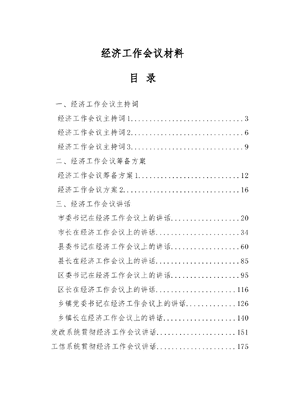 经济工作会议材料目录一、经济工作会议主持词经济工作会议主持词13经济工作会议主持词26经济工作会议主持词39二、经济工作会议筹备方案经济工作会议筹备方案112经济工作会议方案2.16三、经济工作会议讲话市委书记在经济工作会议上的讲话20市长在经济工作会议上的讲话.34县委书记在经济工作会议上的讲话60县长在经济工作会议上的讲话.85区委书记在经济工作会议上的讲话95区长在经济工作会议上的讲话116乡镇党委书记在经济工作会议上的讲话.126乡镇长在经济工作会议上的讲话.140发改系统贯彻经济工作会议讲话151工信系统贯彻经济工作会议讲话175疫情防控和经济发展两手抓会议讲话.190四、经济工作会议表态发言经济工作会议表态发言1200经济工作会议表态发言2203经济工作会议表态发言3205经济工作会议表态发言4207经济工作会议表态发言5210经济工作会议主持词1网络主持词经济工作会议同志们:今天,我们在这里召开全市经济工作会议,总结回顾2019年经济工作,分析当前经济形势,并对2020年经济工作进行安排部署。参加今天会议的有:市四个班子在家领导,法检两长,各县(市)区党政主要领导,市直各部门主要负责同志,以及市属重点企业负责人。今天会议共有四项议程:一是宣读2019年经济主要指标考核结果;二是各承标部门作表态发言;三是市长讲话;四是市委书记讲话。下面,进行会议第一项议程,请市委副书记XX同志宣读2019年经济主要指标考核结果。下面,进行会议第二项议程,请各承标部门作表态发言。首先,请市工信局作表态发言;下面,请市发改委作表态发言;下面,请市农业农村局作表态发言;下面,请高新区作表态发言;下面,请XX县作表态发言。下面,进行会议第三项议程,请市委副书记、市长XX同志作讲话,大家欢迎;下面,进行会议第四项议程,请市委书记XX同志讲话,大家欢迎。同志们,刚才5个单位和部门作了表态发言,XX副书记宣读了2019年经济主要指标考核结果,市长XX同志、市委书记XX同志分别作了讲话,对2019年经济工作进行了系统梳理总结,对2020年经济工作进行了全面安排部署,具有很强的针对性和指导性,大家要结合实际,认真抓好落实。下面,我再强调几点意见:一要吃透精神。学习好、领会好会议精神,是抓好经济工作的前提基础。会后,各部门、各单位要迅速掀起学习贯彻落实会议精神的高潮,通过学习掌握全市经济工作的思路、目标、任务、措施,要领会精神实质、抓住内涵要领,用于指导具体工作。要把本部门、本单位的工作置于全局性的工作之中,真正把会议精神融会贯通到工作里去。二要明确责任。各部门、各单位要结合本职工作,研究好要重点抓哪些大事、抓哪些大项,确定自己的任务目标和措施办法,细化落实市委的部署要求。尤其是每项工作由谁干、干到什么程度,什么时限完成、完不成怎么办,都要有严格明确的说法,决不能流于形式、决不能应付了事。市委、政府督查室要加强督办检查,及时向市委、政府反馈情况并提出建议,保证各项工作高标准、高效率推进。三要改进作风。大家要有一种求真务实、埋头苦干的精神,把更多的时间和精力,用到深入群众、深入基层、深入一线上,潜心研究推动发展的大事、实事、难事,尤其是针对制约发展的问题,要拿出实实在在的解决办法;要有一种发奋图强、忘我工作的精神,对看准瞧明的事,要紧抓不放、锲而不舍,不达目的不罢休、不抓出头不放手;要有一种团结协作、合力攻坚的精神,既讲分工、能够独挡一面,把各自的工作做好,又讲合作、靠群策群力,靠方方面面的共同努力,形成加快发展的合力,切实把会议精神贯彻落实到位。今天的会议就要这里,散会。经济工作会议主持词2网络