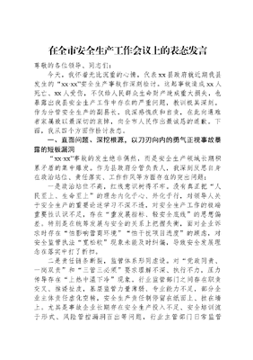 在全市安全生产工作会议上的表态发言尊敬的各位领导、同志们:今天,我怀着无比沉重的心情,代表xx县政府就近期我县发生的xx·xx安全生产事故作深刻检讨。这起事故造成xx人死亡、xx人受伤,不仅给人民群众生命财产造成重大损失,也暴露出我县安全生产工作中存在的严重问题,教训极其深刻。作为分管安全生产的副县长,我深感愧疚和自责,在此向遇难者家属致以最深切的哀悼,向全市人民作出最诚恳的道歉。下面,我从四个方面作检讨表态。一、直面问题、深挖根源,以刀刃向内的勇气正视事故暴露的短板漏洞xx·xx事故的发生绝非偶然,而是安全生产领域长期积累矛盾的集中爆发。作为县政府分管负责人,我深刻反思自身在政治站位、责任落实、工作作风等方面存在的突出问题:一是政治站位不高,红线意识树得不牢。没有真正把人民至上、生命至上的理念内化于心、外化于行,对领导人关于安全生产的重要论述学习不深不透,对安全生产工作的极端重要性认识不足,存在重发展指标、轻安全底线的思想偏差。特别是在统筹发展与安全的关系上把握失衡,面对企业诉求时存在怕影响营商环境怕干扰项目进度的顾虑,对安全监管执法宽松软现象未能及时纠偏,导致安全发展理念在落实中打了折扣。二是责任链条断裂,监管体系形同虚设。对党政同责、一岗双责和三管三必须要求理解不深、执行不力,压力传导存在上热中温下冷现象。行业监管部门之间存在职责交叉、