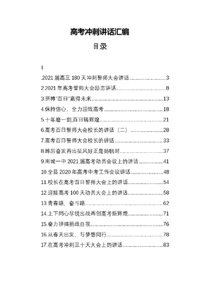 高考冲刺讲话汇编18篇1.2021届高三180天冲刺誓师大会讲话.22.2021年高考誓师大会励志讲话..73.拼搏百日赢得未来..124.保持信心,全力迎战高考175.十年磨一剑, 百日铸辉煌.206.高考百日誓师大会校长的讲话(二)..277.高考百日誓师大会校长的讲话..328.踔厉奋发再出征 风好正是扬帆时369.南城一中2021届高考动员会议上的讲话..4010.全县2020年高考中考工作会议讲话..4711.校长在高考百日誓师大会上的讲话5312.迎接高考100天动员大会上的讲话5713.青春路,奋斗路.6114.上下同心尽锐出战再创高考新辉煌7015.奋力拼搏挑战自我..7516.从春天出发,与梦想同行..7717.在高考冲刺三十天大会上的讲话..8218.为了梦想 全力以赴.852021届高三180天冲刺誓师大会讲话2020年12月9日尊敬的各位领导、老师,亲爱的同学们:大家上午好!就像金黄的秋天挡不住凛冽的寒风一样,凛冽的寒风也挡不住我们心中燃烧的激情,今天我们高三全体师生满怀喜悦与激情,隆重举行高考180天 冲刺誓师暨期中总结表彰大会,就是预备明年火红的夏季打一场漂亮的大胜仗,就是要吹起我们人生志气的进军号,擂响我们攻坚雄心的战鼓声,唱彻我们必胜豪情的铿锵曲!首先请允许我向关心支持我们的校党委校委领导同志,向不辞劳苦、辛勤工作的全体高三教师表示深深的敬意和衷心的感谢,向孜孜以求、奋力拼搏的全体高三同学表示真诚的祝福和美好的祝愿!同学们,光阴似箭,三年即将逝去;斗转星移,高考就在眼前。高中三年,为了破茧成蝶的美丽,为了凤凰涅槃的新生,我们怀着决战高考的豪情,秉持天生我才必有用的信念,演绎夸父逐日的勇敢,诠释精卫填海的执着。一路走来,踏过书山坎坷,渡过学海茫茫,一起沐浴风雨,一起见证朝阳。现在离决战仅剩下180天了,已到了粹火亮剑叱咤沙场展雄风的时刻;已到了扬鞭策马冲刺闯关的时刻了。让挫折为我们铺路,梦想为我们引航。十二年锻铸智慧利剑,一朝亮剑一展雄风!我期待着你们亮剑高考,逐鹿六月。180天,一个让我们触目惊心的数字,不到两百天。今天过去,只剩下179天,178天,100天……指缝太宽,时间太瘦。我们再也无法逃避,不能退缩,甚至再不可以把时间浪费在假如式的幻想。我们唯一该做的,就是硬着头皮咬紧牙关地坚持,不达目的誓不罢休地努力。同学们,从今天起,让我们把握每一天,珍惜每一天。今天放弃的,明天不会得到;今天逃开的难题,明天依然要面对;今天不想解决的,明天未必就能迎刃而解。不要再让粗心成为理由,失误成为借口,要让细节成为努力的方向,让完美变成一种精益求精的可能。让最后的180天,无愧于心的度过。因为,人生没有等出来的辉煌,只有拼出来的美丽。同学们,从今天起,让我们奋战180天,拼搏180天。让我们扫掉身上仅存的哪怕一点颓废松垮之气,用拼搏扼住命运的咽喉,用汗水播撒人生的希望,用自信铸就辉煌,拧成一股绳,搏尽一份力,狠下一条心,共圆一个梦。再搏180天,用智慧丰富内涵,让青春在心中的殿堂写下诗行;再搏180天,凭激情创造灿烂,让雄心智慧在六月里闪耀光芒!因为,考场不同情弱者,竞争不相信眼泪!同学们,高考备考既是一项艰巨的脑力劳动,更是一场智慧的竞争。180天,我们无法延伸其长度;但我们可以拓展其宽度,发掘其深度。这就要求我们竭尽全力,最大限度利用好这180天。在复习策略上