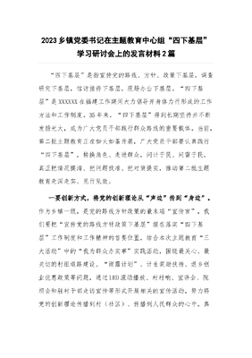 (2篇)2023乡镇党委书记在主题教育中心组“四下基层”学习研讨会上的发言材料.docx