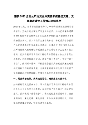 落实2023全面从严治党主体责任和抓基层党建、党风廉政建设工作情况总结.docx