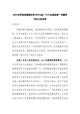 2023在学院党委理论学习中心组“六个必须坚持”专题研讨会上的发言.docx