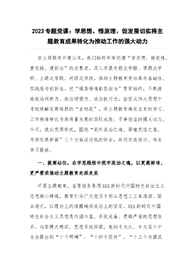 2023专题党课:学思想、悟原理、促发展 切实将主题教育成果转化为推动工作的强大动力.docx