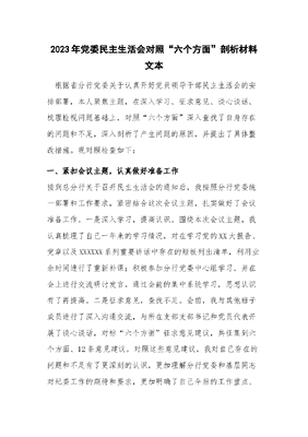 2023年党委民主生活会对照“六个方面”剖析材料文本.docx