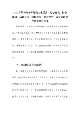 2023年领导班子专题民主生活会“思想意识、初心使命、宗旨立场、纪律作风、职责担当”五个方面检视剖析材料.docx