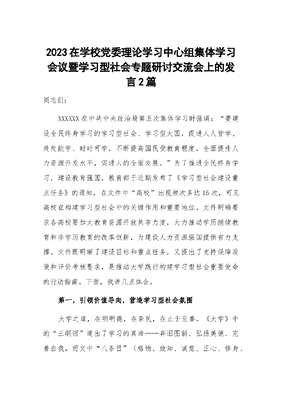 (2篇)2023在学校党委理论学习中心组集体学习会议暨学习型社会专题研讨交流会上的发言.docx