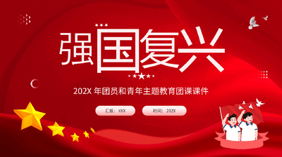 强国复兴202X年团员和青年主题教育团课课件汇报:XXX时间:202X 强国复兴专题,我们将深入学习党的二十大关于全面建成社会主义现代化强国、以中国式现代化全面推进中华民族伟大复兴的战略部署和领导人的相关重要论述,学习了解新时代新征程党和国家事业发展的目标任务,深刻理解中国式现代化是强国建设、民族复兴的唯一正确道路。前言导读党的二十大关于全面建成社会主义现代化强国、以中国式现代化全面推进中华民族伟大复兴的战略部署01领导人重要文章《中国式现代化是强国建设、民族复兴的康庄大道》中强调02新时代新征程党和国家事业发展的目标任务03深刻理解中国式现代化是强国建设 民族复兴的唯一正确道路04目录PART 01党的二十大关于全面建成社会主义现代化强国、以中国式现代化全面推进中华民族伟大复兴的战略部署党的二十大关于全面建成社会主义现代化强国、以中国式现代化全面推进中华民族伟大复兴的战略部署全面建成社会主义现代化强国,总的战略部署安排是分两步走01从2020年到2035年基本实现社会主义现代化;01从2035年到本世纪中叶把我国建设成富强民主文明和谐美丽的社会主义现代化强国未来五年是全面建设社会主义现代化国家开局起步的关键时期经济实力、科技实力、综合国力大幅跃升,人均国内生产总值迈上新的大台阶,达到中等发达国家水平;实现高水平科技自立自强,进入创新型国家前列;建成现代化经济体系,形成新发展格局,基本实现新型工业化、信息化、城镇化、农业现代化;基本实现国家治理体系和治理能力现代化,全过程人民民主制度更加健全,基本建成法治国家、法治政府、法治社会;建成教育强国、科技强国、人才强国、文化强国、健康中国,国家文化软实力显著增强; 人民生活更加幸福美好,居民人均可支配收入再上新台阶,中等收入群体比重明显提高,基本公共服务实现均等化农村基本具备现代化生活条件,社会保持长期稳定,人的全面发展、全体人民共同富裕取得更为明显的实质性进展;广泛形成绿色生产生活方式,碳排放达峰后稳中有降,生态环境基本好转,美丽中国目标基本实现;国家安全体系和能力全面加强,基本实现国防和军队现代化。党的二十大关于全面建成社会主义现代化强国、以中国式现代化全面推进中华民族伟大复兴的战略部署 到2035年,我国发展的总体目标是党的二十大关于全面建成社会主义现代化强国、以中国式现代化全面推进中华民族伟大复兴的战略部署中国式现代化01是中国共产党领导的社会主义现代化• 既有各国现代化的共同特征,更有基于自己国情的中国特色。02是人口规模巨大的现代化• 我国十四亿人口整体迈进现代化社会,规模超现有发达国家人口总和,艰巨性、复杂性前所未有,发展途径和推进方式必然具有自身特点。党的二十大关于全面建成社会主义现代化强国、以中国式现代化全面推进中华民族伟大复兴的战略部署03是全体人民共同富裕的现代化• 共同富裕是中国特色社会主义的本质要求,也是一个长期的历史过程。我们坚持把实现人民对美好生活的向往作为现代化建设的出发点和落脚点,着力维护和促进社会公平正义,着力促进全体人民共同富裕,坚决防止两极分化。04是物质文明和精神文明相协调的现代化• 物质富足、精神富有是社会主义现代化的根本要求。我们不断厚植现代化的物质基础,不断夯实人民幸福生活的物质条件,同时大力发展社会主义先进文化,加强理想信念教育,传承中华文明,促进物的全面丰富和人的全面发展。党的二十大关于全面建成社会主义现代化强国、以中国式现代化全面推进中华民族伟大复兴的战略部署05是人与自然和谐共生的现代化• 人与自然是生命共同体,我们坚持可持续发展,坚持节约优先、保护优先、自然恢复为主的方针,坚定不移走生产发展、生活富裕、生态良好的文明发展道路,实现中华民族永续发展。06是走和平发展道路的现代化• 我国不走一些国家通过战争、殖民、掠夺等方式实现现代化的老路。那种损人利己、充满血腥的老路给广大发展中国家人民带来深重苦难。我们坚定站在历史正确的一边,站在人类文明进步的一边,高举和平、发展、合作、共赢旗帜,在坚定维护世界和平与发展中谋求自身发展,又以自身发展更好维护世界和平与发展。党的二十大关于全面建成社会主义现代化强国、以中国式现代化全面推进中华民族伟大复兴的战略部署中国式现代化的本质要求坚持中国共产党领导,坚持中国特色社会主义实现高质量发展,发展全过程人民民主丰富人民精神世界,实现全体人民共同富裕促进人与自然和谐共生,推动构建人类命运共同体,创造人类文明新形态PART 02领导人重要文章《中国式现代化是强国建设、民族复兴的康庄大道》中强调领导人重要文章《中国式现代化是强国建设、民族复兴的康庄大道》中强调要把中国式现代化的中国特色转变为成功实践,把鲜明特色变成独特优势,需要付出艰巨努