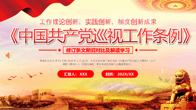 汇报人:XXX时间:202X/XX新社北京华2月21日电2024年1月31日,中共中央印了修后的《中共党巡工作例》发订国产视条(以下《例》简称条),出通知,要求各地各部遵照行。并发区门认真执修订条文新旧对比及解读学习工作理新、新、制度新成果论创实践创创新社北京华2月21日电2024年1月31日,中共中央印了修后的发订《中共党巡工作例》国产视条(以下《例》简称条),出通知,要求并发各地各部遵照行。区门认真执《例》持以近平新代条坚习时中特色社主思想指国会义为导,深入近平于贯彻习总书记关党的自我革命的重要思想,以党章根本依据,新代为总结时巡工作理新、新视论创实践创、制度新成果,推巡工创进视作高量展具有重要意。质发义各党委级(党组)要把学习贯《例》作重要政治任彻条为务,好宣解和督促,抓传读检查确保《例》各定落到条项规实。要持政治巡定位,把处坚视作根本任,推两个维护为务政治督具体化、精准化、进监常化。要在强化巡整改态视压整改任。实责工作理新、新、制度新成果论创实践创创CONTENTS01《例》修背景及意条订义02《例》修文新比条订条旧对03政治巡定位和巡工作视视04巡加强一把手的督视对监05巡干部伍建新要求视队设党的十八大以,以近平同志核心的党中央高度重巡工作,把巡作推党的自我革命、全面治党的略性制度安排。近平来习为视视视为进从严战习总书记50次听取巡、表重要,作出一系列重要述,巡工作深化展指明了方向、提供了根本遵循。视汇报发讲话论为视发< 第一章 >修订条文新旧对比及解读学习工作理新、新、制度新成果论创实践创创党的十八大以,以近平同志核心的党中央高度重巡工作来习为视视,把巡作推党的自我革命、全面治党的略性制度安排视为进从严战。近平习总书记50次听取巡、表重要,作出一系列视汇报发讲话重要述,巡工作深化展指明了方向、提供了根本遵循。论为视发 党的二十大政治巡利作用、加强巡整改和成果用对发挥视剑视运作出新部署。近平强,要把巡利磨得更光更亮,勇习总书记调视剑于亮,始做到利高、震常在。剑终剑悬慑 次修《例》,持以近平新代中特色社主思想这订条坚习时国会义为指,深入近平于党的自我革命的重要思想,以党导贯彻习总书记关章根本依据,新代巡工作理新、新、制度为总结时视论创实践创创新成果,一步健全巡工作体制机制、任体系,于持和加进视责对坚强党中央巡工作的集中一、推巡工作高量展具对视统领导进视质发有重要意。义第一章第一 落全面治党要求,党政治生活,化党政治生,加强党督,范巡工作,根据《中共党章程》总则条为实从严严肃内净内态内监规视国产,制定本例。条< 第二章 >修订条文新旧对比及解读学习工作理新、新、制度新成果论创实践创创中共党巡工作例国产视条(2017年)第一章总则第一条 落全面治党要求,党政治生活,化党政治生,加为实从严严肃内净内态强党督,范巡工作,根据《中共党章程》,制定本例。内监规视国产条第三条 巡工作以克思列宁主、毛思想、小平理、三代表重视马义泽东邓论个要思想、科展指,深入近平系列重要精神和治理学发观为导贯彻习总书记讲话国政新理念新思想新略,牢固立政治意、大局意、核心意、看意,战树识识识齐识定不移以近平同志核心的党中央坚维护习为权威和集中一,推五位一体体布局和推四全面略布统领导统筹进总协调进个战局,新展理念,定中特色社主的道路自信、理自信、制度自贯彻发坚对国会义论信、文化自信,尊崇党章,依治党,落中央巡工作方,规实视针深化政治巡,聚焦持党的、加强党的建、全面治党,、视坚领导设从严发现问题形成震,推改革、促展,确保党始成中特色社主事的强慑动进发终为国会义业坚核心。领导第四条巡工作持中央一、分视坚统领导级负责;持事求是、依法依坚实规;坚持群路、民主。众线发扬工作理新、新、制度新成果论创实践创创中共党巡工作例国产视条(2024年)第一章总则第一条 了持和加强党巡工作的全面,推新代巡工作高量展为坚对视领导进时视质发,根据《中共党章程》,制定本例。国产条第二条 巡工作是上党下党履行党的能任的政治督,根视级组织对级组织领导职责监本任是近平党中央的核心、全党的核心地位,以近平务坚决维护习总书记坚决维护习同志核心的党中央威和集中一。为权统领导巡工作持、形成震,推改革、促展的方。视坚发现问题慑动进发针第三条 巡工作以克思列宁主、毛思想、小平理、三代表重要思视马义泽东邓论个想、科展、近平新代中特色社主思想指,深入落近平学发观习时国会义为导贯彻实习于党的自我革命的重要思想,深刻悟确立的定性意,增强四总书记关领两个决义意、定四自信、做到,尊崇党章,依治党,全面党的个识坚个两个维护规贯彻巡工作方,推政治督具体化、精准化、常化,政治巡利作用,加视针进监态发挥视剑强巡整改和成果用,促完善党和家督体系、健全全面治党体系,深视运进国监从