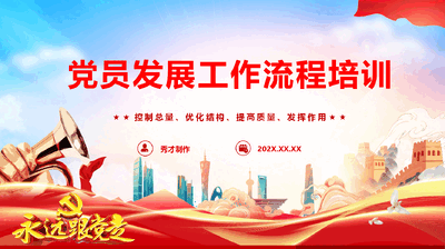 党员发展工作流程培训秀才制作202X.XX.XX★★控制总量、优化结构、提高质量、发挥作用★★发展党员工作是党的建设一项经常性重要工作,是党的建设新的伟大工程的—项基础工程,是党员队伍建设的重要组成部分。做好发展党员工作,是保持党的先进性纯洁性、落实从严治党方针和凝聚中国力量实现第二个一百年奋斗目标、实现中华民族伟大复兴中国梦的现实需要。前 言 PREFACE在建设中国特色社会主义事业中,不断涌现出来的认真贯彻执行党的基本路线、献身改革开放和现代化建设事业、诚心诚意为人民谋利益、带领群众为经济发展和社会进步做出实绩的先进分子,是党组织接收新党员的源泉。前 言 PREFACE前 言 PREFACE党组织只有经常不断地对这些先进分子进行教育和培养,在他们提出入党要求并且具备党员条件时,及时把他们吸收到党内来,才能不断壮大党员队伍,改善党员队伍结构,提高党员队伍素质,保持党员队伍生机活力,担负起新的历史使命。目 录 CONTENTS 一、入党基本条件和要求目录 三、党员的基本权利和义务 二、党员发展工作流程及要求第一部分入党基本条件和要求第一部分入党基本条件和要求年满十八岁的中国工人、农民、军人、知识分子和其他社会阶层的先进分子,承认党的纲领和章程,愿意参加党的一个组织并在其中积极工作、执行党的决议和按期交纳党费的,可以申请加入中国共产党。——2022年10月22日党
