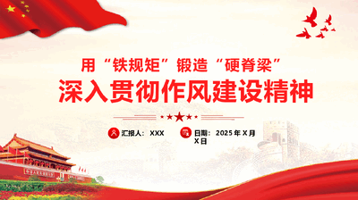 用铁规矩锻造硬脊梁深入贯彻作风建设精神汇报人:XXX日期:2025年X月X日 党中央决定,自2025年全国两会后至7月在全党开展深入贯彻中央XX规定精神学习教育。领导人高度重视,亲自谋划确定学习教育主题,发表重要讲话,作出重要指示,为开展学习教育指明了方向。3月中旬,中共中央办公厅印发《关于在全党开展深入贯彻中央XX规定精神学习教育的通知》。再次释放了作风建设只有进行时、没有完成时的强烈信号。同学们作为入党积极分子,是高校中积极向党组织靠拢的先进力量,更要深刻领会并积极践行中央XX规定精神,用这一铁规矩锻造自己的硬脊梁,切实把思想和行动统一到党中央决策部署上来,在未来为党和国家的事业贡献更大的青春力量。前言目录一、中央XX规定与中央XX规定精神二、铁规矩(中央XX规定精神)的重要性三、如何用 铁规矩 锻造 硬脊梁?四、违反中央XX规定精神的典型案例及警示五、总结与展望第一部分中央XX规定与中央XX规定精神中央XX规定和中共XX规定精神中央XX规定中央XX规定精神对这两个概念同学们能区分吗?先有中央XX规定再有中央XX规定精神。一、中央XX规定中国共产党自成立以来,始终注重作风建设,从三大纪律XX注意到三大作风,再到两个务必,党的作风建设贯穿于党的发展历程之中。新时期以来,由于一系列客观原因和自身思想的松懈,某些党员领导干部党性