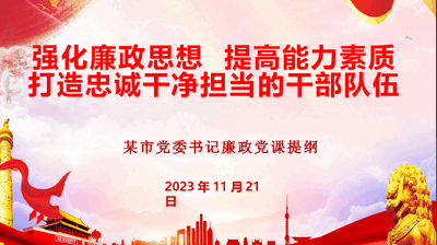 强化廉政思想提高能力素质打造忠诚干净担当的干部队伍2023年11月21日某市党委书记廉政党课提纲目录二永葆对党忠诚的政治本色一认清打造忠诚干净担当干部队伍的重大意义三打牢个人干净的从政之基四提升敢于担当的能力素质四提升敢于担当的能力素质第一部分 认清打造忠诚干净担当干部队伍的重大意义第一,这是党的伟大号召认清打造忠诚干净担当干部队伍的重大意义G 一第二,这是时代的客观需要忠诚干净担当,是衡量领导干部是否合格、是否过硬的基本标准。第三,这是干部的普遍要求第二部分永葆对党忠诚的政治本色三个必然要求和三大工程忠诚是共产党人必须具备的优秀品格,是每个党员入党宣誓时的庄严承诺。习近平总书记指出,对党绝对忠诚,要害在绝对两个字,就是唯一的、彻底的、无条件的、不掺任何杂质的、没有任何水分的忠诚。永葆对党忠诚的政治本色G 二一要坚定政治信念。永葆对党忠诚的政治本色G 二二要加强政治学习。三要严守政治纪律。第三部分打牢个人干净的从政之基一要始终做到敢于担当。打牢个人干净的从政之基G 三二要始终做到严谨缜密。三要始终做到精益求精。第四部分提升敢于担当的能力素质谢 谢