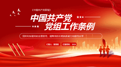 汇报人:某某某 汇报时间:202X坚持和加强党的全面领导,提高党的长期执政能力和领导水平党组工作条例中国共产党《中国共产党章程》坚持和加强党的全面领导,提高党的长期执政能力和领导水平总 则第一章总则为了进一步规范和改进党组工作,坚持和加强党的全面领导,提高党的长期执政能力和领导水平,更好发挥党总揽全局、协调各方的领导核心作用,根据《中国共产党章程》,制定本条例。第一条党组是党在中央和地方国家机关、人民团体、经济组织、文化组织和其他非党组织的领导机关中设立的领导机构,在本单位发挥领导作用,是党对非党组织实施领导的重要组织形式。第二条总则党组工作必须坚持以马克思列宁主义、毛同志思想、邓同志理论、三个代表重要思想、科学发展观、领导人新时代中国特色社会主义思想为指导,坚决维护领导人核心地位,坚决维护党中央权威和集中统一领导,切实履行领导职责,充分发挥领导作用,不断提高领导水平,确保本单位全面贯彻党的基本理论、基本路线、基本方略,确保党始终成为中国特色社会主义事业的坚强领导核心。第三条总则(一)坚持旗帜鲜明讲政治,加强党的领导,增强四个意识、坚定四个自信、做到两个维护,坚决贯彻落实党的理论和路线方针政策,坚决贯彻落实党中央重大决策部署,在思想上政治上行动上同以领导人为核心的党中央保持高度一致;(二)坚持全面从严治党,担当管党治党主体责任,贯彻新时代党的建设总要求,贯彻新时代党
