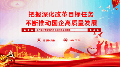 把握深化改革目标任务不断推动国企高质量发展深入学习贯彻党的二十届三中全会精神秀才精心制作2024.07.31 党的二十届三中全会是在全面建设社会主义现代化国家新征程开局起步的关键时期召开的一次十分重要的会议,事关党和国家事业继往开来,事关中国特色社会主义前途命运,事关中华民族伟大复兴,对凝聚和激励全党全军全国各族人民高举中国特色社会主义伟大旗帜、为全面建设社会主义现代化国家团结奋斗具有十分重大的政治意义、理论意义、战略意义、实践意义。前言导读全会最重要的成果就是审议通过了《中共中央关于进一步全面深化改革、推进中国式现代化的决定》(下称《决定》),部署了未来五年的重大改革举措。对于国资国企系统深化改革,全会再次肯定了深化国资国企改革的总基调,并且提出了深化改革的三大目标:做强做优做大,增强核心功能,提升核心竞争力。与此同时,提出了几个改革的重点领域,包括开展国有经济增加值核算,打造原创技术策源地,自然垄断行业竞争性环节的市场化改革等。前言导读深入学习贯彻党的二十届三中全会精神,是当前和今后一个时期的重大政治任务和工作主题,国资国企改革应当是围绕上述方面着重推进。落实好深化国有企业改革的最新要求,要坚持做强做优做大国有资本和国有企业,依靠改革不断破除制约企业高质量发展的体制机制弊端,切实提高发展质量和效益,持续巩固推进中国式现代化的战略力量。要扎实落实好各项改革重点任务,与国有企业改革