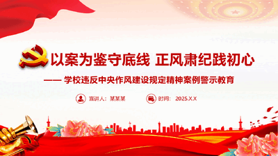 宣讲人:某某某时间:2025.X.X以案为鉴守底线 正风肃纪践初心——学校违反中央作风建设规定精神案例警示教育前言领导人在二十届中央纪委二次全会上发表重要讲话强调,制定实施中央作风建设规定,是我们党在新时代的徙木立信之举,必须常抓不懈、久久为功,直至真正化风成俗,以优良党风引领社风民风。这一重要论断,犹如一盏明灯,为我们指明了作风建设的前进方向。今天,我们以近年来教育系统特别是高校领域查处的违纪违法典型案例为镜鉴,深入剖析问题根源,明确纪律红线,强化责任担当,旨在为营造风清气正的育人环境提供坚实保障。目录典型案例剖析:触目惊心的四风乱象1案例警示:从破纪到破法的深刻教训2以自我革命精神推进高校作风建设3一典型案例剖析:触目惊心的四风乱象以案为鉴 正风肃纪——高校违反中央作风建设规定精神案例警示教育【案例一】公权私用,违规公款旅游——大庆医学高等专科学校学生处处长刘宪勤案一、典型案例剖析:触目惊心的四风乱象以案为鉴【案例二】利益勾连,接受管理服务对象宴请——南方医科大学南方医院党委原副书记曹瑞案【案例三】靠校吃校,违规干预经营——天津农学院总务处原副处长李亮案【案例四】集体违规,滥发津补贴——海南省海口技师学院原院长李日祥案【案例五】奢靡享乐,超标配备办公用房——长春市农业科学院原党委书记于连军案典型案例以案为鉴 正风肃纪——高校违反中央作风建设规定精神案例警示教