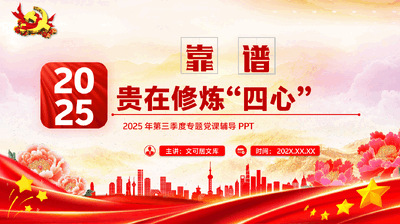 2025年第三季度专题党课辅导PPT贵在修炼四心2025靠谱主讲:文可居文库时间:202X.XX.XX靠谱,在汉语词典里解释为稳妥、可靠、值得相信和托付。它是从离谱衍生出来的反义词。谱是音乐的符号,也是演唱的依据。如果离谱,就会跑调走形,让人听起来很不舒适。现代人借用靠谱一词,来形容行得正和靠得住。过去夸一个人用的最多的词,无非是能力强聪明勤奋自律努力……但渐渐地,我们发现,这个世界上从来就不缺聪明的人,稀缺的倒是为人处事靠谱踏实之人。靠谱是一种很珍贵的品质,它往往自带一种安全属性,我们与靠谱的人相处,不用猜疑顾虑,不用提心吊胆,有一种从内心生出的踏实,让人放心安心,成为对不断蔓延的信任危机的一种有效对冲。在机关,对一个干部最高的评价是靠谱。得到这种夸奖,意味着这位同志可靠、可信、可用,前景自然一片光明。前言修炼朴拙心Cultivate a simple and honest heart04修炼同理心Cultivate empathy03修炼责任心Cultivate a sense of responsibility02修炼进取心Cultivate Enterprising Spirit01目录CONTENTS修炼朴拙心Cultivate a simple and honest heart04修炼同理心Cultivate