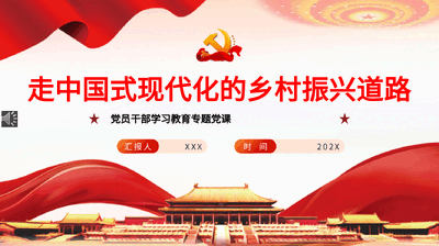 XXX汇报人202X时间党员干部学习教育专题党课走中国式现代化的乡村振兴道路前言2022年中央农村工作会议上,习近平总书记强调:没有农业农村现代化,社会主义现代化就是不全面的。党的十八大以来,以习近平同志为核心的党中央围绕全面推进乡村振兴、加快农业农村现代化作出了一系列战略部署。党的十九大首次将乡村振兴写入党章,党的二十大提出加快建设农业强国,扎实推动乡村产业、人才、文化、生态、组织振兴。走中国式现代化的乡村振兴道路既是实现中华民族伟大复兴的必然逻辑,也是构建新发展格局的可靠保障,还是建设农业强国的内在要求。总结和梳理中国式现代化的乡村振兴道路的形成和科学内涵,对探索乡村振兴实践路径具有重要的现实意义。党的二十大报告指出:全面推进乡村振兴。全面建设社会主义现代化国家,最艰巨最繁重的任务仍然在农村。目录CONTENT1中国式现代化的乡村振兴道路的形成2中国式现代化乡村振兴道路的科学内涵3中国式现代化乡村振兴的实现路径中国式现代化的乡村振兴道路的形成第一部分第一部分-中国式现代化的乡村振兴道路的形成中国式现代化的乡村振兴道路是中国式现代化道路的组成部分既有各国现代化的共同特征,更有基于自己国情的中国特色。•20世纪50年代,我国第一次提出实现工业、农业、交通运输业和国防四个现代化目标,1964年又提出把我国建设成为一个具有现代农业、现代工业、现代国防和现代科学技术的社会主义强国,农业现代化始终是中国现代化的基石。•党的十一届三中全会以来,中国共产党人以巨大的政治勇气,深刻总结社会主义建设过程中的正反两方面经验教训,以经济建设为中心,解决人民日益增长的物质文化需要与落后的社会生产之间的矛盾。•1987年,党的十三大提出三步走发展战略构想,分阶段解决人民温饱问题、人民生活达到小康水平和基本实现现代化。实现小康生活是从中国国情出发对四化目标内涵的重大调整,20世纪80年代中国式现代化道路逐渐清晰,从解决温饱开始的中国式现代化成为人类历史上开启现代化的独特路径。党中央提出精准扶贫精准脱贫基本方略,通过持续8年奋斗,打赢了脱贫攻坚战,解决了中华民族千年以来的绝对贫困问题。党的十八大以来,现行标准下9899万农村贫困人口全部脱贫,832个贫困县全部摘帽,12.8万个贫困村全部出列,农村基础设施得到大幅度提升,医疗、教育、卫生等公共服务得到显著改善。2021年,中国如期全面建成小康社会。第一部分-习近平总书记强调乡村振兴是一盘大棋,要把这盘大棋走好,系统阐述了实施乡村振兴战略的总目标、总方针和总要求。《乡村振兴战略规划(2018—2022年)》《中华人民共和国乡村振兴促进法》和近年来的中央一号文件,为全面推进中国式现代化的乡村振兴提供了制度保障。党的二十大科学把握全面推进乡村振兴的历史方位和战略定位,坚持农业农村优先发展,加快建设现代农业强国。党的十九大对全面建成社会主义现代化强国作出了战略部署,把乡村振兴作为破解三农问题的总抓手。从解决温饱到全面建成小康社会,再到分两步走全面实现农业农村现代化,这是中国共产党在长期探索过程中立足于中国历史与现实国情而逐步形成的一条中国式现代化的乡村振兴道路。•走中国式现代化的乡村振兴道路充分体现了我们党对乡村发展规律的认识,也拓展了发展中国家农业农村走向现代化的途径,为人类实现现代化提供了全新选择。中国式现代化的乡村振兴道路的形成中国式现代化乡村振兴道路的科学内涵第二部分第二部分-随着城市化与工业化的快速发展,世界各国大都经历过农村基础设施薄弱、农业经济地位下降、青壮年人口持续外流、环境污染和资源短缺等共性问题,一些发达国家率先兴起乡村振兴运动,但由于国情不同,各国的乡村振兴道路千差万别。中国式现代化乡村振兴道路的科学内涵中国式现代化的乡村振兴道路具有人口规模巨大、全体农村居民共同富裕、物质文明和精神文明相协调、人与自然和谐共生、三农高质量发展的科学内涵。实现农村人口规模巨大的现代化体现了普惠与共享。截至2022年底,全国人口为141175万人,其中城镇常住人口92071万人、乡村常住人口49104万人,城镇化率65.22%。习近平总书记指出:如果在现代化进程中把农村4亿多人落下,到头来一边是繁荣的城市、一边是凋敝的农村,这不符合我们党的执政宗旨,也不符合社会主义的本质要求。走中国式现代化的乡村振兴道路,就是基于中国农村人口规模巨大这一主要特征,加快补齐三农工作短板,推动农业全面升级、农村全面进步、农民全面发展。第二部分-中国式现代化乡村振兴道路的科学内涵共同富裕是社会主义的本质特征。新时代主要矛盾是人民日益增长的美好生活需要和不平衡不充分的发展之间的矛盾,而最大的不平衡是城乡不平衡,最大的不充分是农村发展不充分,这是我国现代化所面临的现实困境和巨大挑