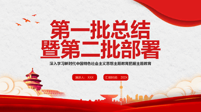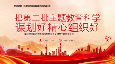 总结好第一批主题教育有效做法和成功经验学习贯彻新时代中国特色社会主义思想主题教育工作把第二批主育科题教学把第二批主育科题教学好精心好谋划组织好精心好谋划组织汇报人:XXX时间:20XX.X学习贯彻新时代中国特色社会主义思想主题教育第一批总结暨第二批部署会议9月5日在京召开。中共中央政治局常委、中央学习贯彻新时代中国特色社会主义思想主题教育领导小组组长蔡奇出席会议并讲话。他强调,在党中央坚强领导下,第一批主题教育在以学铸魂、以学增智、以学正风、以学促干上取得明显成效。要认真学习领会、贯彻落实领导人重要指示精神,贯彻落实第二批主题教育指导意见,以高度负责的精神把第二批主题教育科学谋划好、精心组织好。前言PREFACE主题教育第一批总结暨第二批部署会议学习领导人在主题教育工作会议上的讲话精神010203以学铸魂 以学增智 以学正风 以学促干目录ONTENT主育第一批题教总结第二批部署暨会议第01部分学习贯彻新时代中国特色社会主义思想主题教育工作主题教育第一批总结暨第二批部署会议各地区各部门各单位在第一批主题教育中牢牢把握学思想、强党性、重实践、建新功的总要求蔡奇指出突出主题主线,一体推进各项重点措施,党员干部深刻领悟两个确立的决定性意义、坚决做到两个维护的自觉性有了新提高,用新时代中国特色社会主义思想凝心铸魂取得新成效,推动高质量发展取得新进步,人民群众获得感、幸福感、安全感有了新增强,政治生态呈现新气象。主题教育第一批总结暨第二批部署会议各级党委(党组)要把开展第二批主题教育作为重要政治任务紧紧抓在手上,层层压实责任,加强督促指导,坚持统筹兼顾,善始善终、善作善成,确保取得实效。第一批主题教育的有效做法和成功经验,对开展第二批主题教育具有重要指导作用,各地区各部门各单位要结合实际坚持好、运用好。要全面贯彻落实党中央部署,精心组织开展第二批主题教育。要注重把准目标要求,注重加强分类指导,注重解决实际问题,注重抓好衔接联动,注重防止形式主义、官僚主义。蔡奇强调人在主学习领导题教育工作上的会议讲话精神第02部分学习贯彻新时代中国特色社会主义思想主题教育工作学习领导人在主题教育工作会议上的讲话精神强国建设、民族复兴的宏伟目标令人鼓舞、催人奋进,我们这一代共产党人使命光荣、责任重大。我们要以这次主题教育为契机,加强党的创新理论武装,不断提高全党马克思主义水平,不断提高党的执政能力和领导水平,为奋进新征程凝心聚力,踔厉奋发、勇毅前行,为全面建设社会主义现代化国家、全面推进中华民族伟大复兴而团结奋斗。领导人强调学习目的主题教育学习领导人在主题教育工作会议上的讲话精神以县处级以上领导干部为重点在全党深入开展学习贯彻新时代中国特色社会主义思想主题教育,是贯彻落实党的二十大精神的重大举措,对于统一全党思想、解决党内存在的突出问题、始终保持党同人民群众血肉联系、推动党和国家事业发展,具有重要意义。这次主题教育:重要意义领导人指出学习领导人在主题教育工作会议上的讲话精神要在推动学习贯彻新时代中国特色社会主义思想走深走实上下功夫,教育引导党员、干部从思想上正本清源、固本培元,不断提高政治判断力、政治领悟力、政治执行力,增强四个意识、坚定四个自信、做到两个维护,始终在思想上政治上行动上同党中央保持高度一致,做到心往一处想、劲往一处使,共同把党锻造成一块攻无不克、战无不胜的坚硬钢铁。教育引导广大党员、干部学思想、见行动,树立正确的权力观、政绩观、事业观,增强责任感和使命感,不断提高推动高质量发展本领、服务群众本领、防范化解风险本领,加强斗争精神和斗争本领养成,提振锐意进取、担当有为的精气神。教育引导各级党组织和广大党员、干部突出问题导向,查不足、找差距、明方向,接受政治体检,打扫政治灰尘,纠正行为偏差,解决思想不纯、组织不纯方面存在的突出问题,不断增强党的自我净化、自我完善、自我革新、自我提高能力,使我们党始终充满蓬勃生机和旺盛活力,始终成为中国特色社会主义事业的坚强领导核心。学习领导人在主题教育工作会议上的讲话精神学思想强党性重实践建新功这次主题教育要牢牢把握学思想、强党性、重实践、建新功的总要求。总要求领导人强调学习领导人在主题教育工作会议上的讲话精神全面系统掌握这一思想的基本观点、科学体系,把握好这一思想的世界观、方法论,坚持好、运用好贯穿其中的立场观点方法,不断增进对党的创新理论的政治认同、思想认同、理论认同、情感认同,真正把马克思主义看家本领学到手,自觉用新时代中国特色社会主义思想指导各项工作。深刻领会这一思想关于坚定理想信念、提升思想境界、加强党性锻炼等一系列要求,始终保持共产党人的政治本色。要全面学习领会新时代中国特色社会主义思想1 要自觉用新时代中国特色社会主义思想改造主观世界2