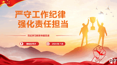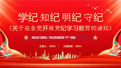 学纪《于在全党展党育的通知》关开纪学习教党纪学习教育/党纪党政教育PPT模板汇报人:XXXX|汇报时间:20XX知纪明纪守纪前 言 年初提到的2024年党内一项重要政治任务,正式部署来了。 近日,中共中央办公厅印发《关于在全党开展党纪学习教育的通知》。 4月3日,中央党的建设工作领导小组召开会议,学习贯彻领导人关于党纪学习教育的重要讲话和重要指示精神,听取党纪学习教育准备工作情况汇报,研究部署党纪学习教育工作。一起迅速了解本次部署透露的信息。目录 关于在全党开展党纪学习教育的通知012024党纪学习教育是什么、学什么、怎么学?02党纪学习教育讲话金句03关于在全党开展党纪学习教育的通知第壹章节关于在全党开展党纪学习教育的通知为深入学习贯彻修订后的《中国共产党纪律处分条例》(以下简称《条例》),经党中央同意,自2024年4月至7月,在全党开展党纪学习教育。通知指出关于在全党开展党纪学习教育的通知《通知》明确要坚持以领导人新时代中国特色社会主义思想为指导,聚焦解决一些党员、干部对党规党纪不上心、不了解、不掌握等问题,组织党员特别是党员领导干部认真学习《条例》,做到学纪、知纪、明纪、守纪,搞清楚党的纪律规矩是什么,弄明白能干什么、不能干什么,把遵规守纪刻印在心,内化为言行准则,进一步强化纪律意识、加强自我约束、提高免疫能力,增强政治定力、纪律定力、道德定力、抵腐定力,始终做到忠诚干净担当。关于在全党开展党纪学习教育的通知推动《条例》入脑入心。要加强警示教育,深刻剖析违纪典型案例,注重用身边事教育身边人,让党员、干部受警醒、明底线、知敬畏。要加强解读和培训,深化《条例》理解运用。2024年度县处级以上领导班子民主生活会和基层党组织组织生活会,要把学习贯彻《条例》情况作为对照检查的重要内容。党纪学习教育要注重融入日常、抓在经常。要原原本本学,坚持个人自学与集中学习相结合,紧扣党的政治纪律、组织纪律、廉洁纪律、群众纪律、工作纪律、生活纪律进行研讨,《通知》强调关于在全党开展党纪学习教育的通知《通知》要求各级党委(党组)要把开展党纪学习教育作为重要政治任务,精心组织实施,加强督促落实。要做好宣传引导工作,坚决反对形式主义,防止低级红、高级黑。2024党纪学习教育是什么、学什么、怎么学?第贰章节2024党纪学习教育是什么、学什么、怎么学?开展时间经党中央同意,自2024年4月至7月在全党开展党纪学习教育。重要意义:这次党纪学习教育,是加强党的纪律建设、推动全面从严治党向纵深发展的重要举措。进一步深化对加强党的纪律建设重要性和忽视党纪、违反党纪问题危害性的认识。推动各级党组织和领导班子从严抓好党的纪律建设,推动广大党员、干部强化遵守纪律的自觉。以严明的纪律确保全党自觉同以领导人为核心的党中央保持高度一致,统一思想、统一行动,知行知止、令行禁止。形成推进中国式现代化的强大动力和合力。开展目的2024党纪学习教育是什么、学什么、怎么学?目标要求①教育引导党员干部学纪、知纪、明纪、守纪,②搞清楚党的纪律规矩是什么,弄明白能干什么、不能干什么,③始终做到忠诚干净担当。在学习贯彻《中国共产党纪律处分条例》上下功夫见成效。坚持逐章逐条学、联系实际学。抓好以案促学、以训助学。教育引导党员干部准确掌握其主旨要义和规定要求,进一步明确日常言行的衡量标尺。用党规党纪校正思想和行动。真正使学习党纪的过程成为增强纪律意识、提高党性修养的过程。学习重点2024党纪学习教育是什么、学什么、怎么学?要压实各级党组织的领导责任,各级领导班子和党员领导干部带头学习,推动党员干部高质量完成党纪学习教育任务。要加强宣传引导,力戒形式主义,以良好作风保证党纪学习教育走深走实。要坚持两手抓两促进,把开展党纪学习教育同落实党中央重大决策部署、完成本地区本部门本单位重点工作紧密结合起来,使党纪学习教育每项措施都成为促进中心工作的有效举措,切实防止两张皮。党纪学习教育讲话金句第叁章节党纪学习教育讲话金句党的纪律为党组织和党员干部划定了行为空间,明确了权利与责任,是我们党自我净化、焕发活力的重要保障从小事小节上严格要求,不能在月黑风高无人见的自欺欺人中乱了心智,不能在你知我知天知地知的花言巧语中迷了方向,不能在富贵险中求的侥幸心理中铤而走险,不能在法不责众的错误认识中恣意妄为。党纪学习教育讲话金句党纪学习教育讲话金句•敢于板起脸来批评,敢于狠下心来问责,就能有效防止破窗效应,使纪律真正成为带电的高压线。•纪律是管党治党的戒尺,也是党员、干部约束自身行为的标准和遵循。•对年轻干部强化纪律教育,要深刻理解严管就是厚爱,信任不能代替监督的内涵,当